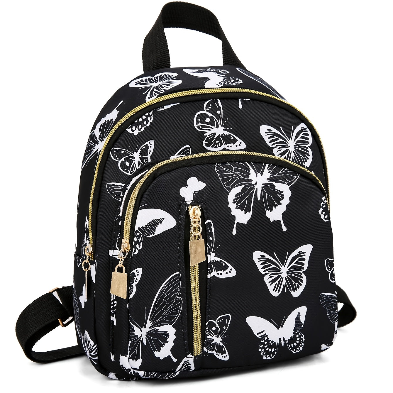 Women's Black Mini Backpack with Butterfly Print Nylon Casual Daypack