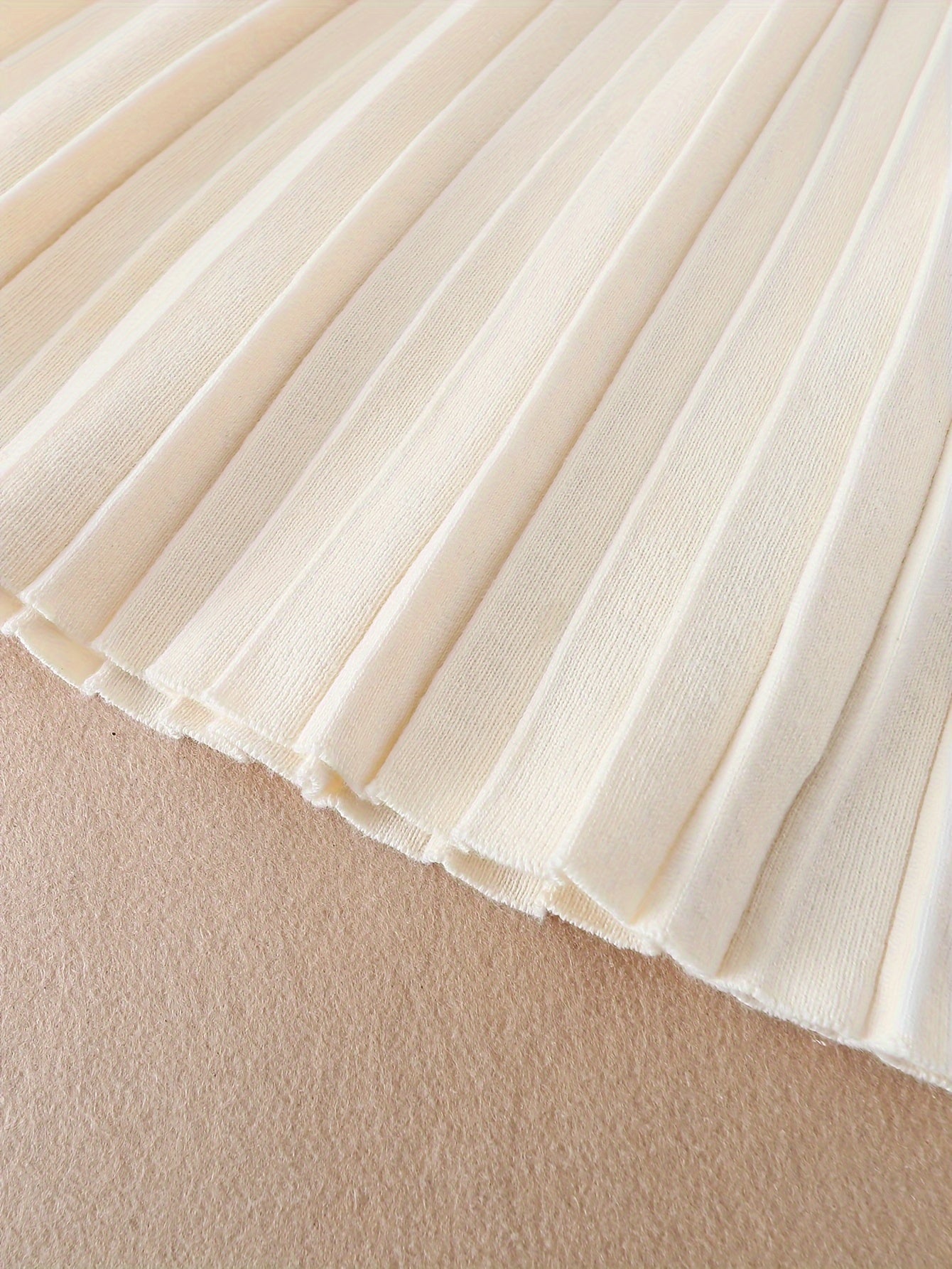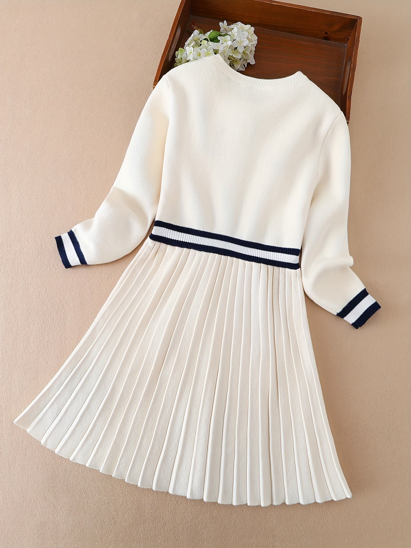Girls' Long Sleeve Pleated A-Line Dress with Navy Accents Cotton Nylon for Spring Fall
