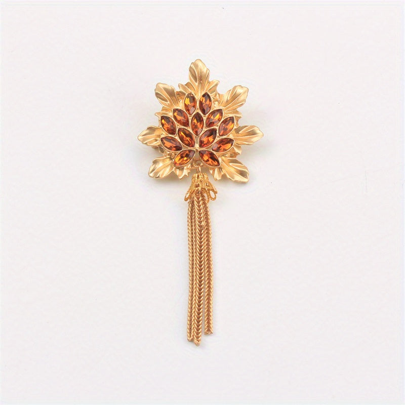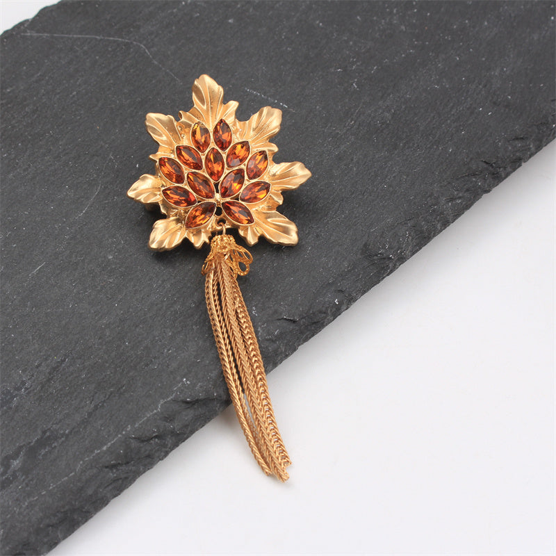 Fashion Brooch Maple Leaf Design with Gold Rhinestones Fringe Accessory