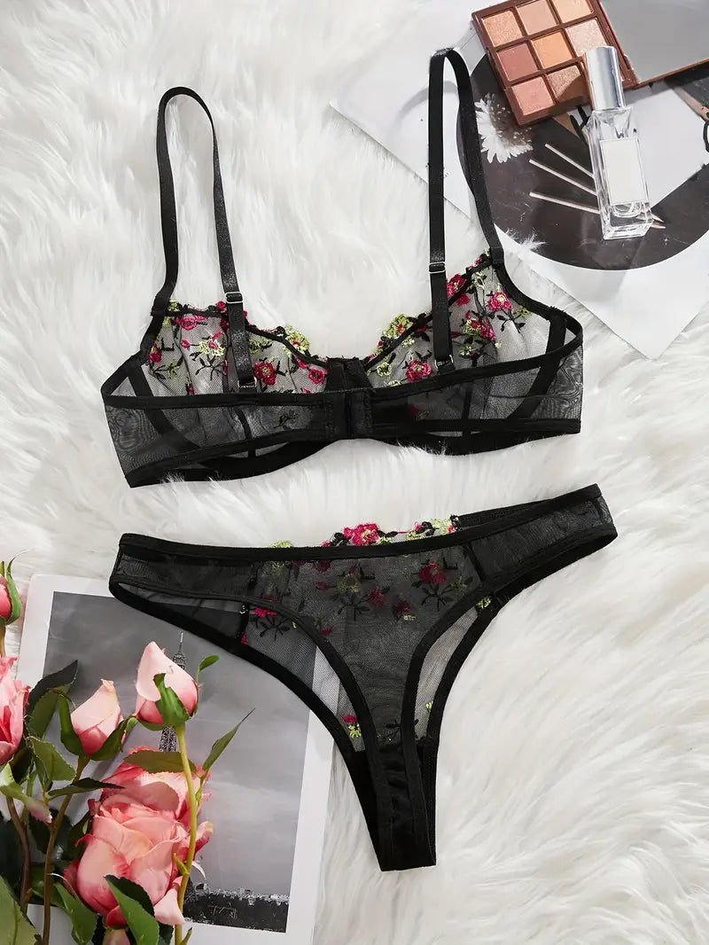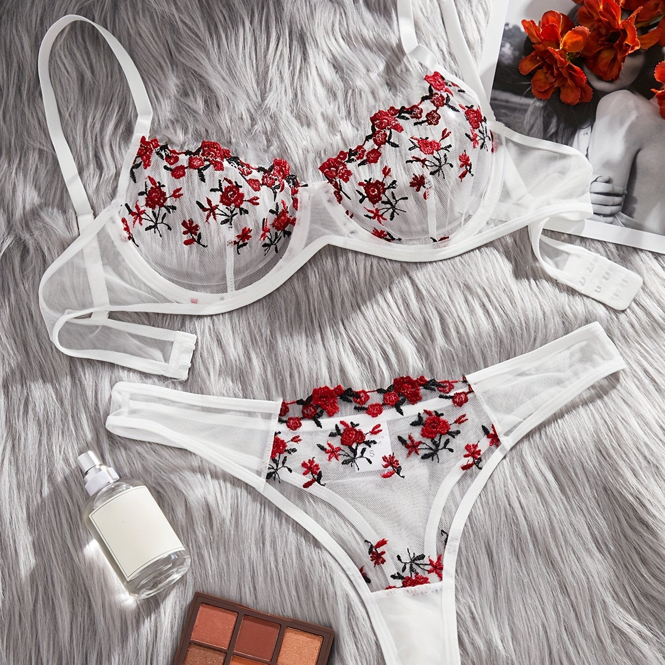 Women's Floral Embroidered Lingerie Set Polyester Knit Mesh Bra Drop Waist Briefs