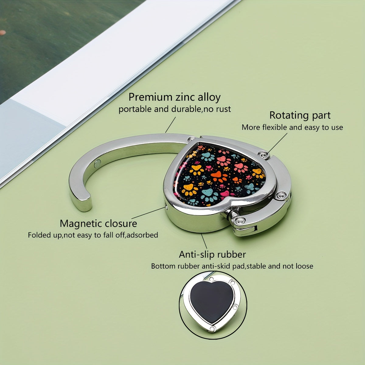 Heart-Shaped Foldable Purse Hook with Paw Print Design Zinc Alloy Handbag Table Hook