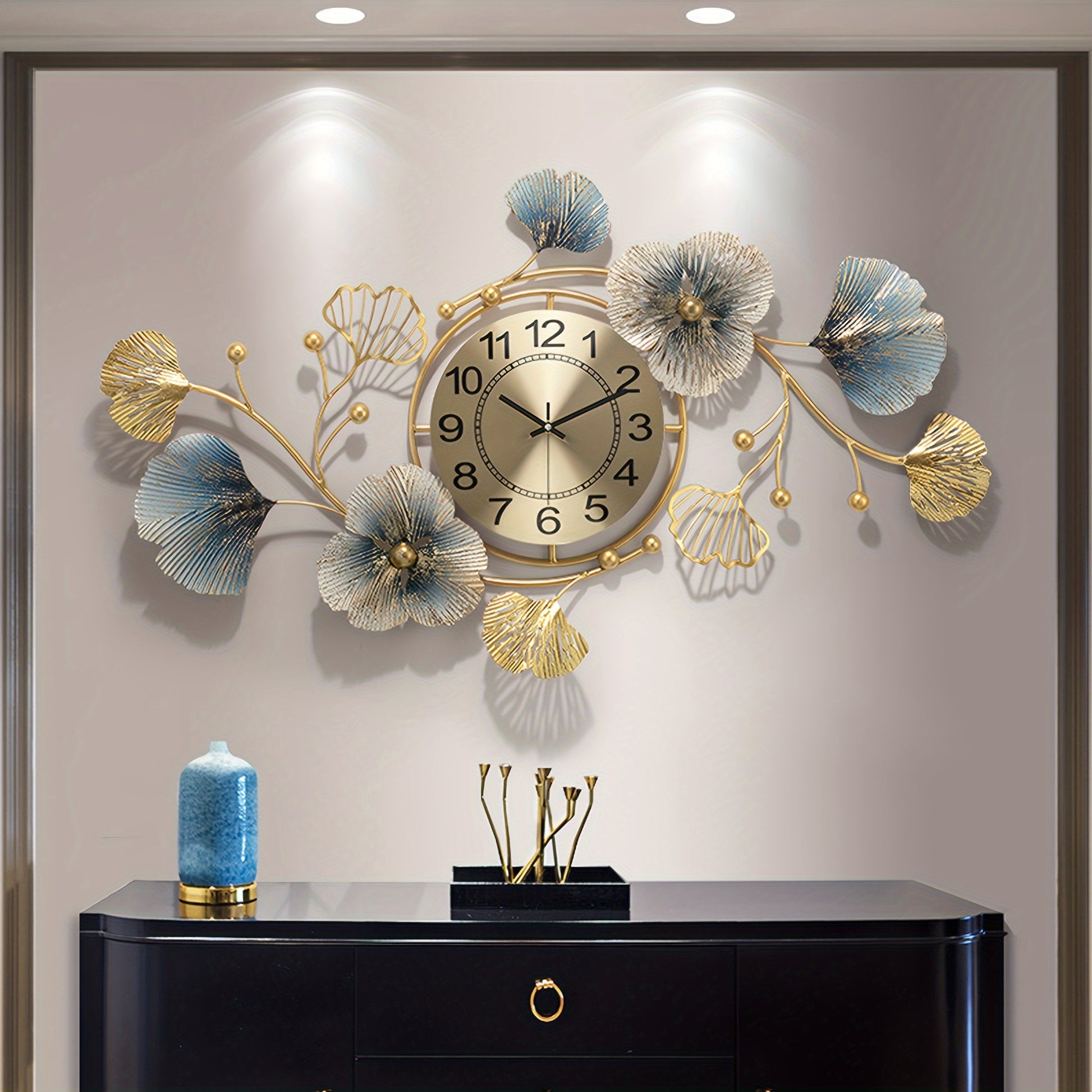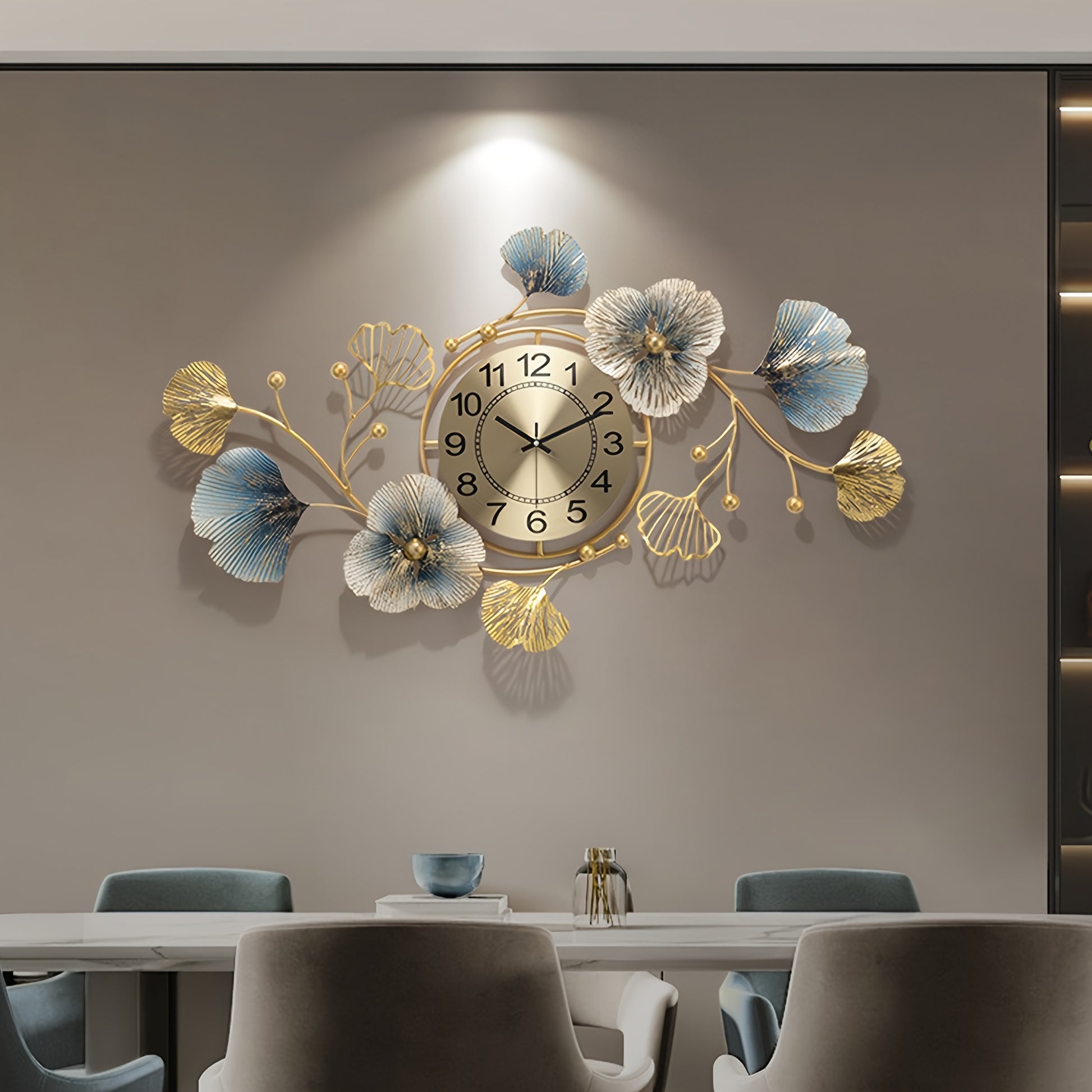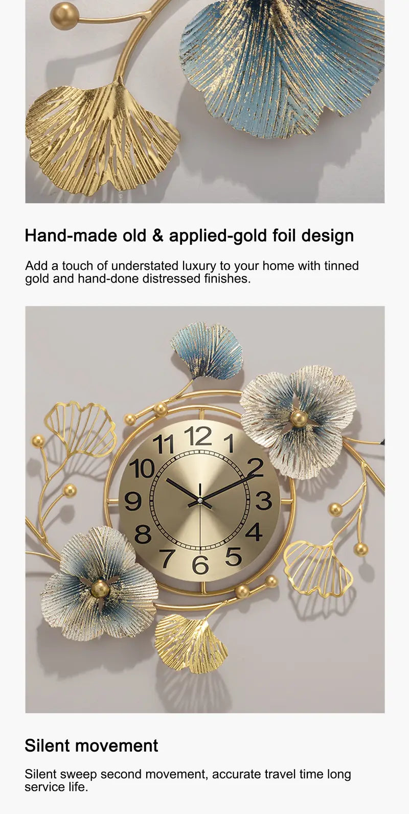 Ginkgo Leaf Metal Wall Clock Silent Floral Design Battery Operated