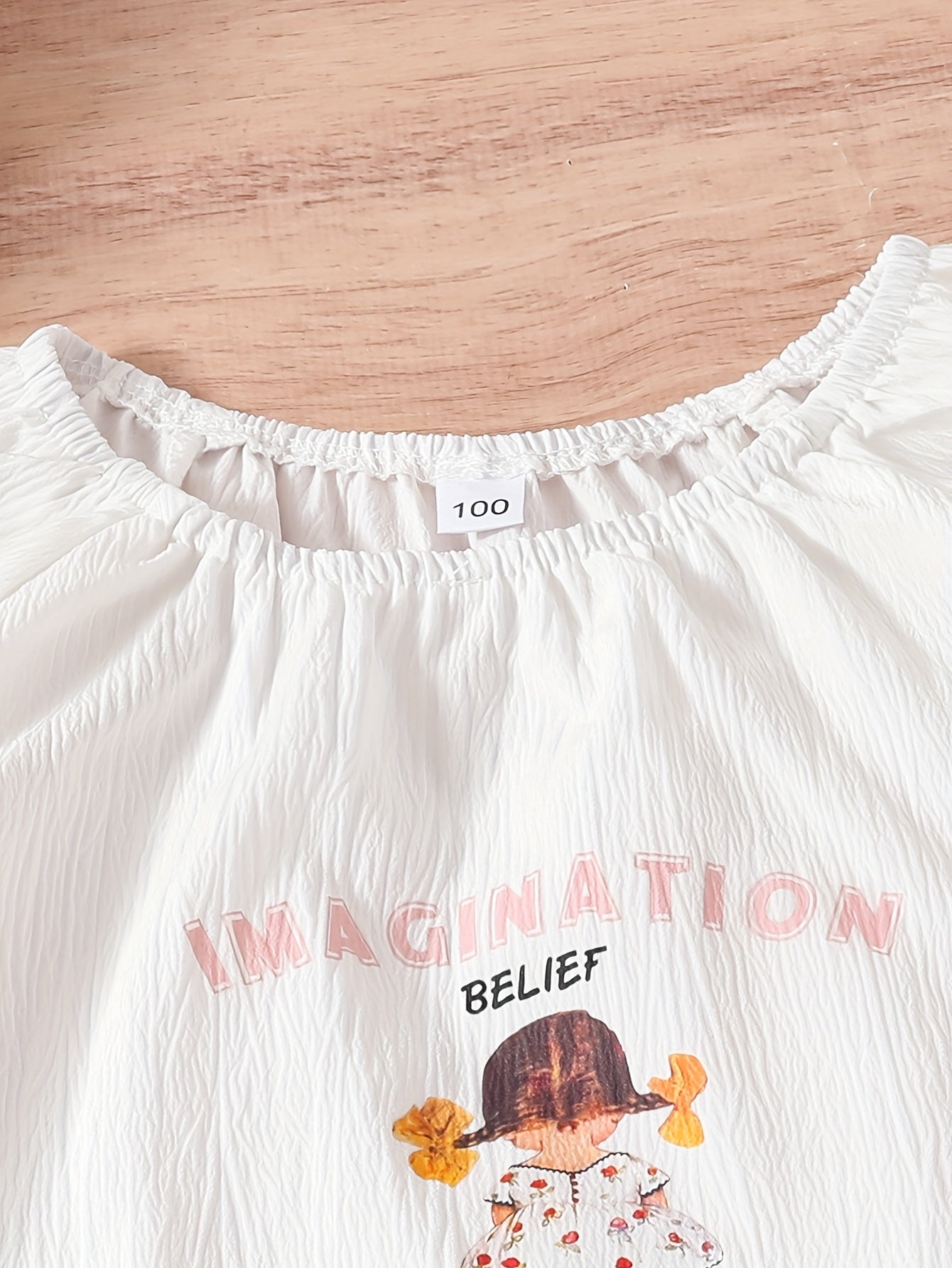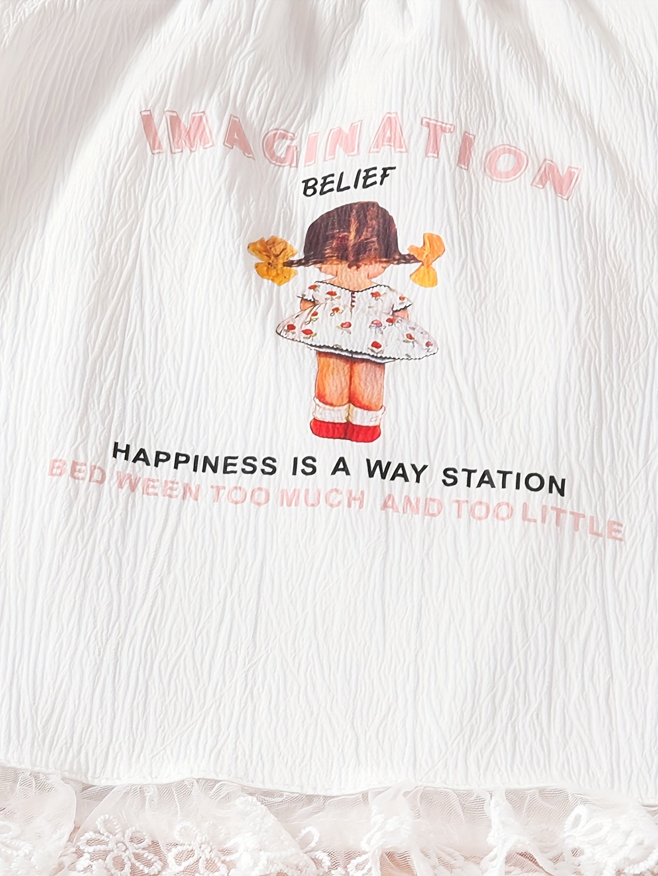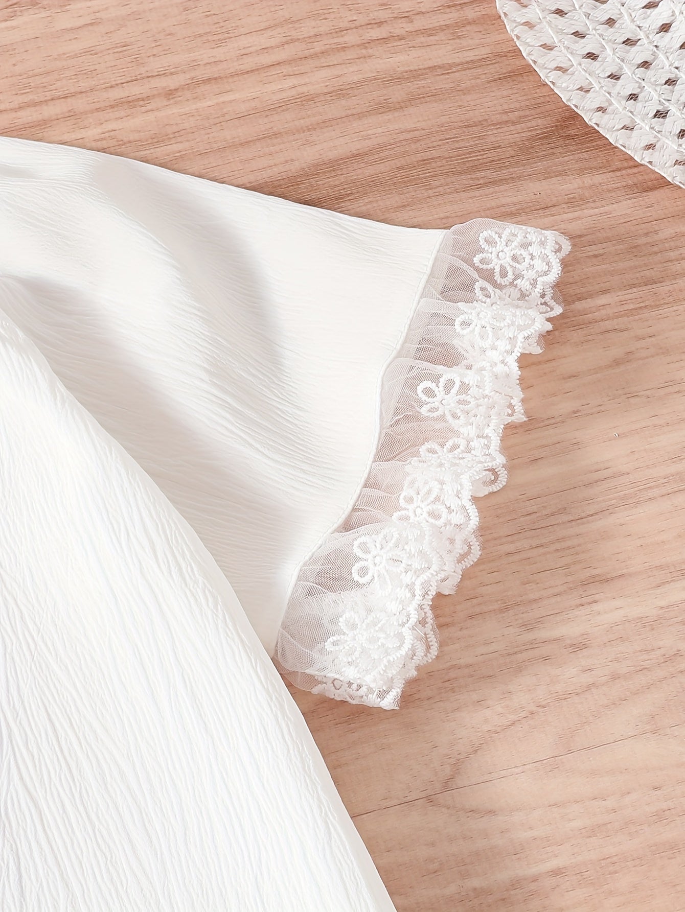 Girls Summer Outfit Set with Lace-Trimmed Top and Faux Denim Pants for Casual Outdoor Wear