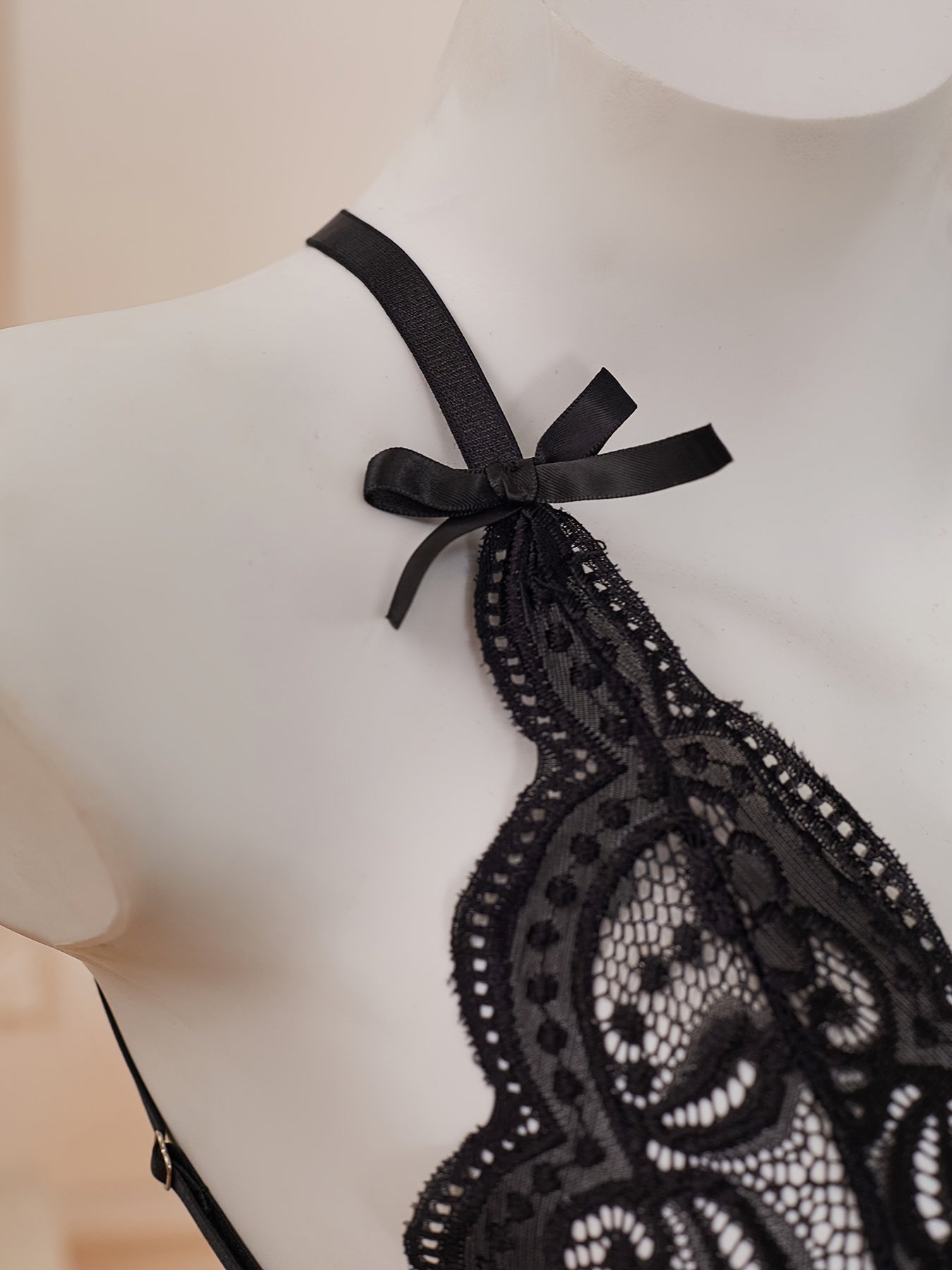 Women’s Lace Bodysuit Deep V Halter Backless Hollow Details Polyamide Elastane Solid