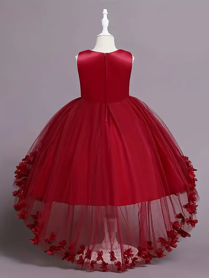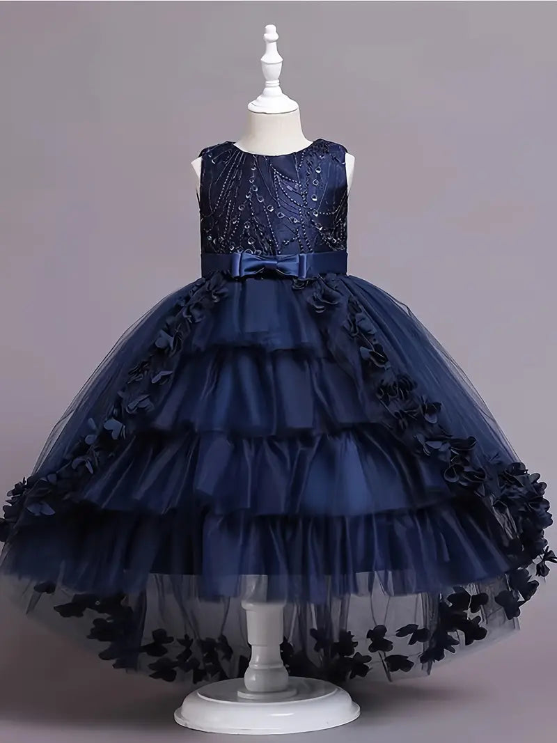 Girls Navy Blue Floral Princess Dress Sleeveless Midi Sequin Beaded Tulle for Special Occasions