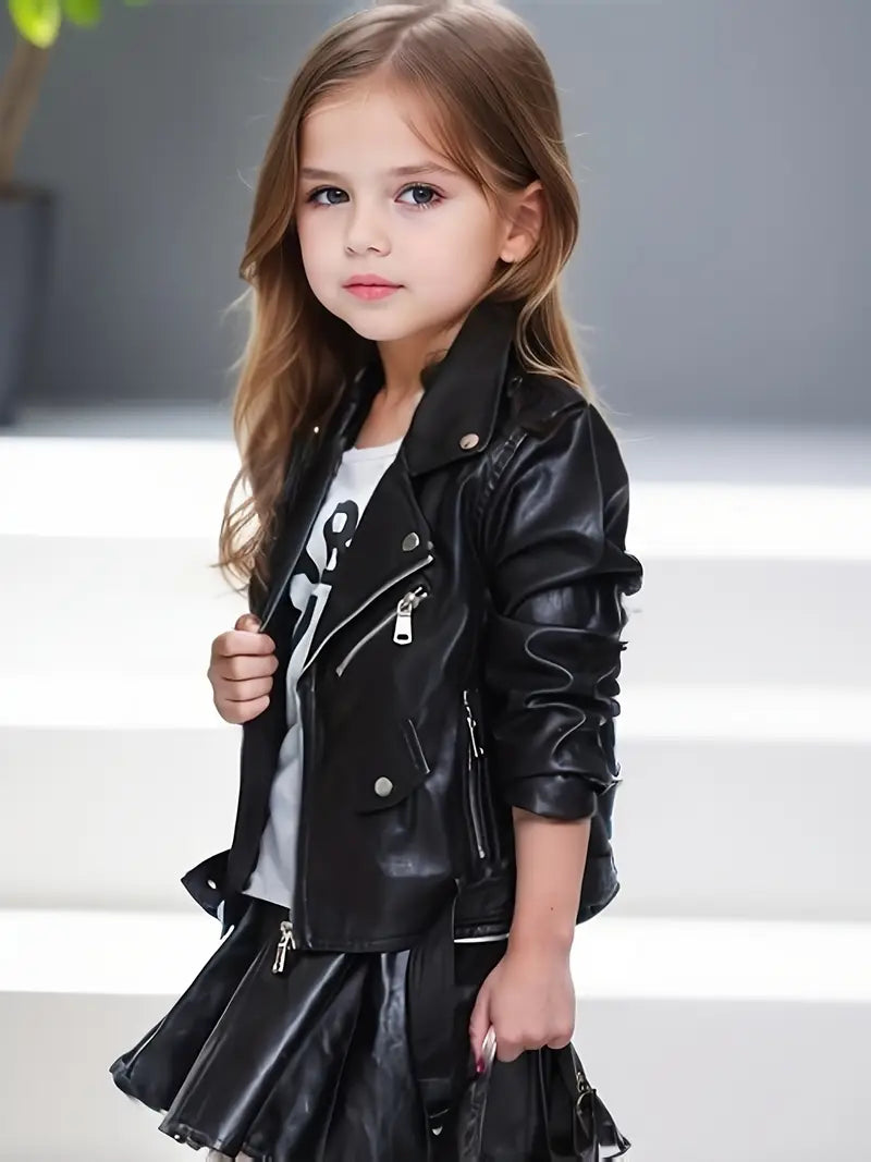 Girls PU Leather Motorcycle Jacket Fall Winter Long Sleeve Zipper Lapel Solid Color