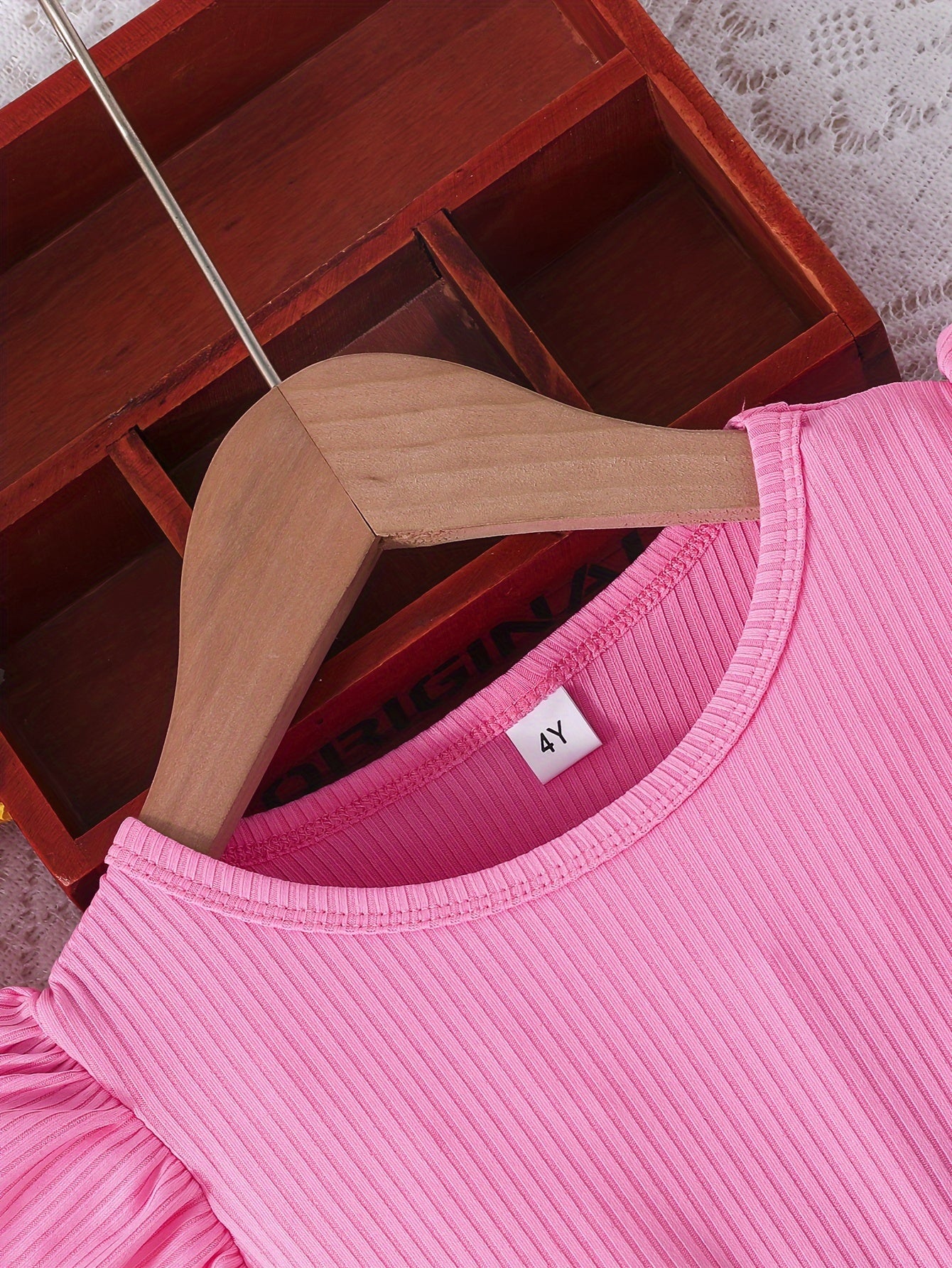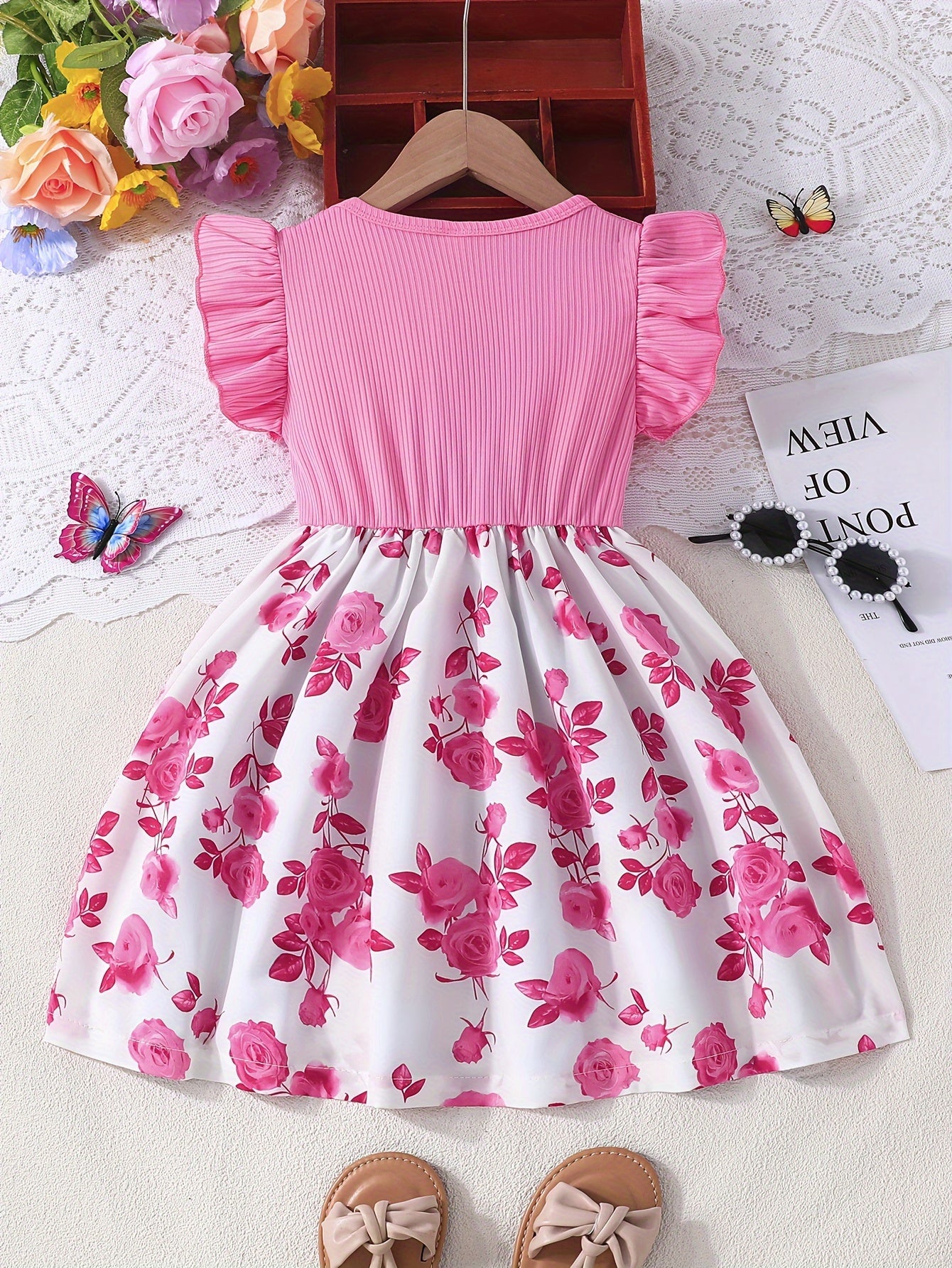Girls Rose Print Dress with Ruffle Sleeves and Bow Waist for Casual and Outdoor Wear
