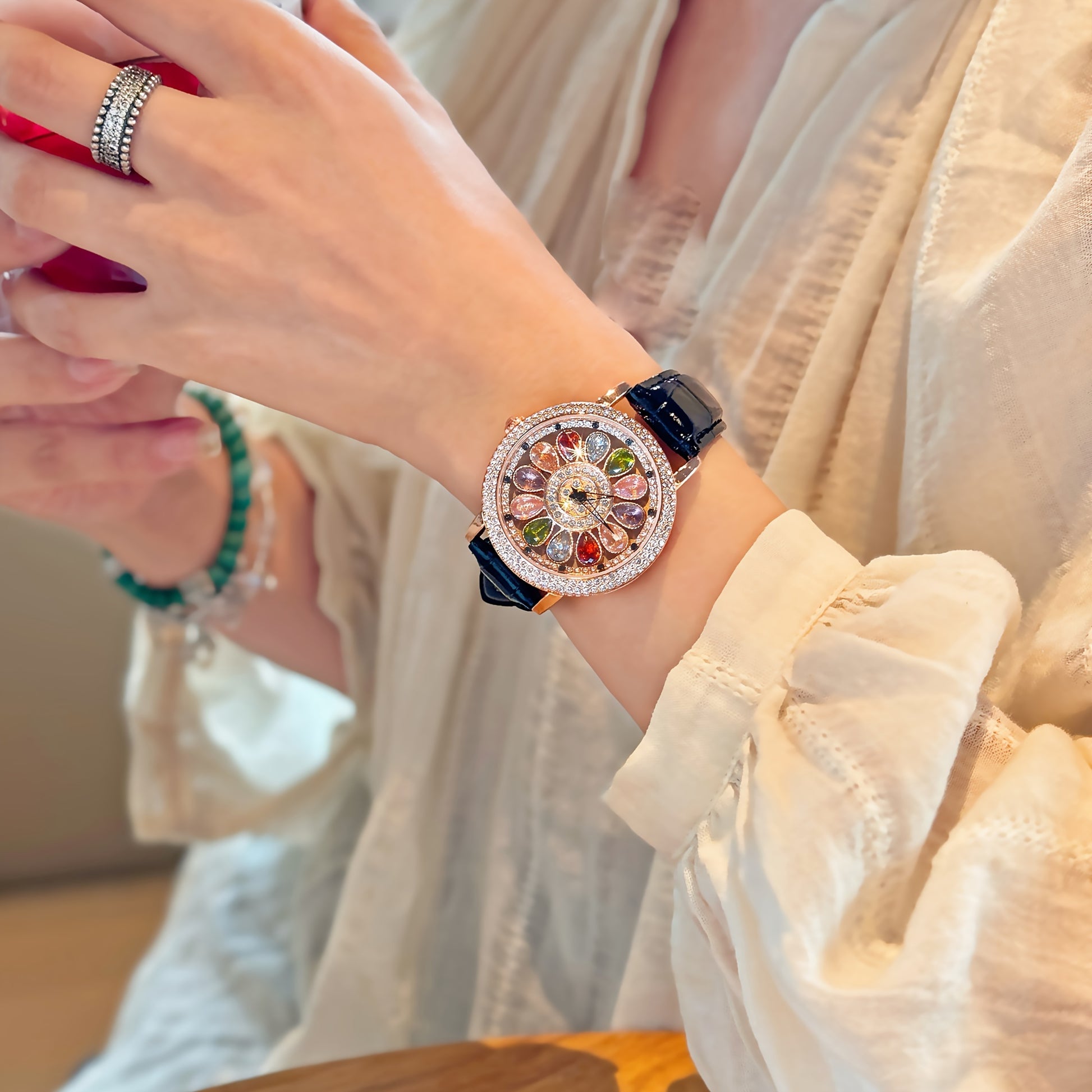 Women's Quartz Watch with Colorful Rhinestones, Alloy Case, PU Leather Strap