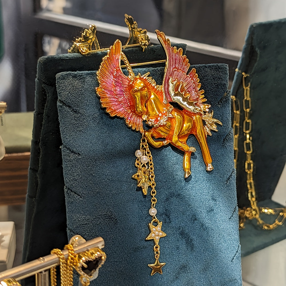Vintage Enamel Pegasus Brooch Pin with Celestial Stars and Pearls for Women