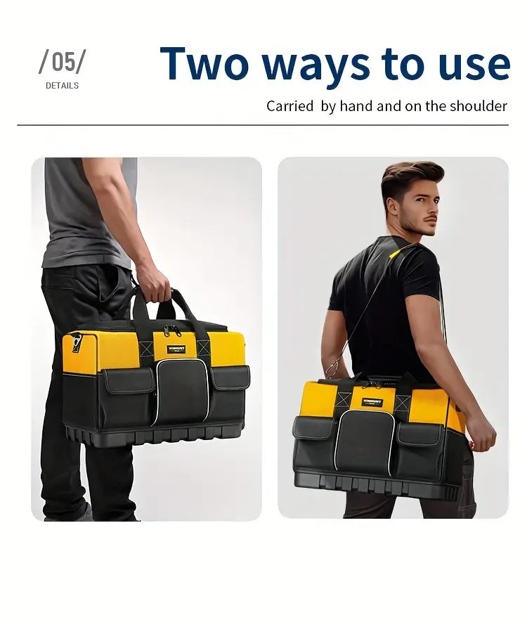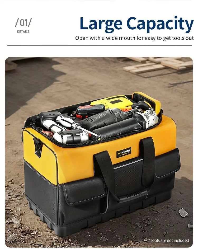 Large Waterproof Heavy Duty Tool Bag with Molded Base Polyester Black Yellow Adjustable Shoulder Strap