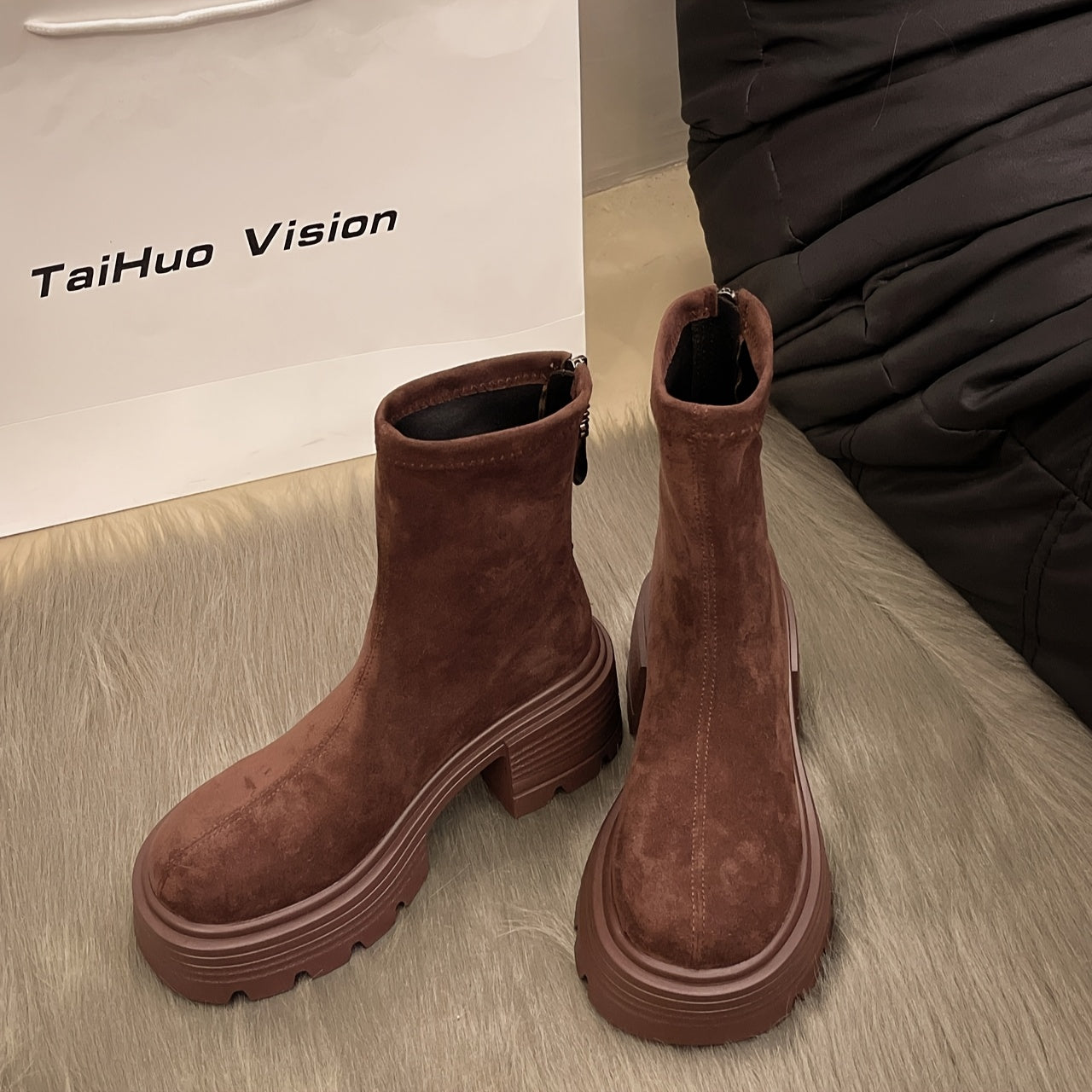 Women Chunky Platform Ankle Boots Brown Slip-On Zipper Cushioned Sole