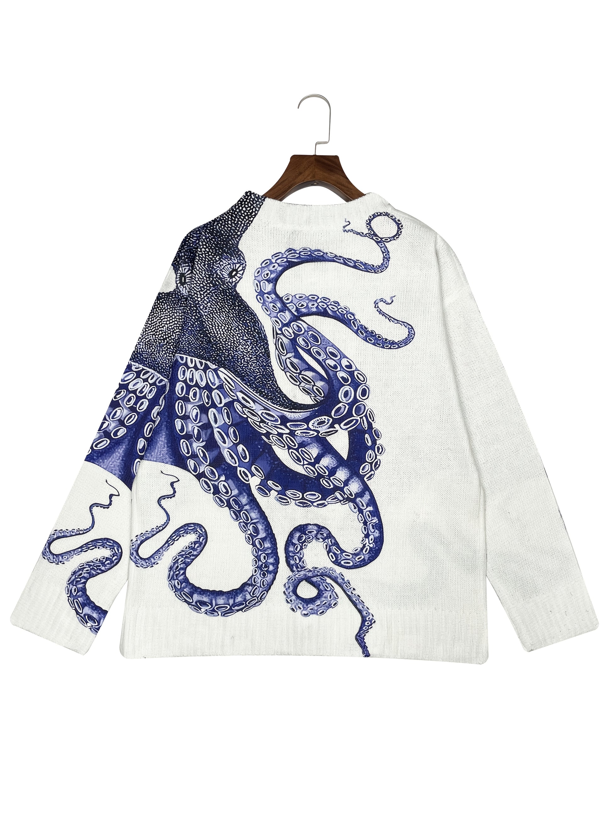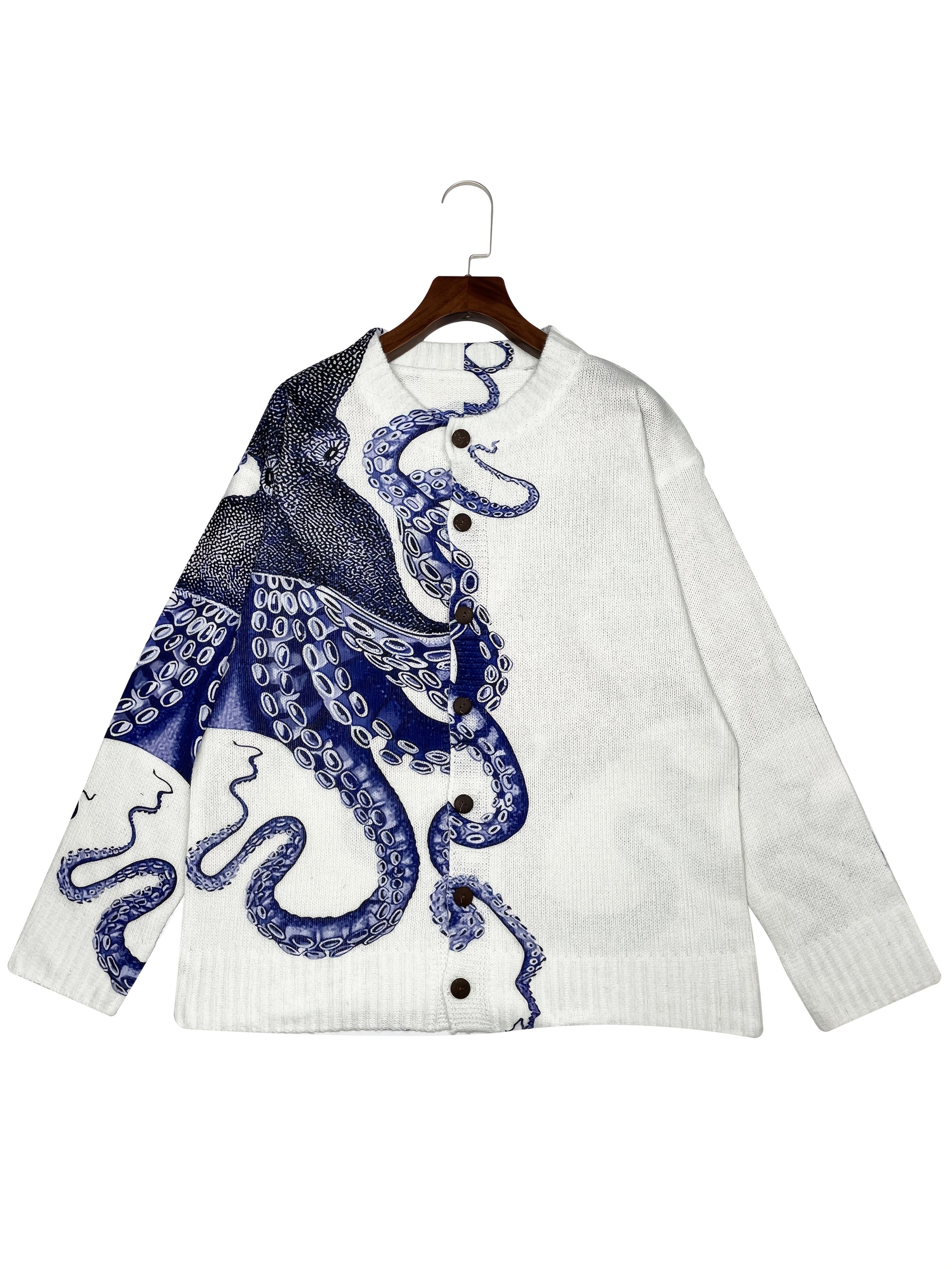 Women's 3D Printed Octopus Cardigan Blue Color Block Casual Sweater