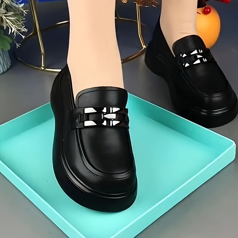 Women's Black Platform Loafers Round Toe Chunky Heel Casual Shoes