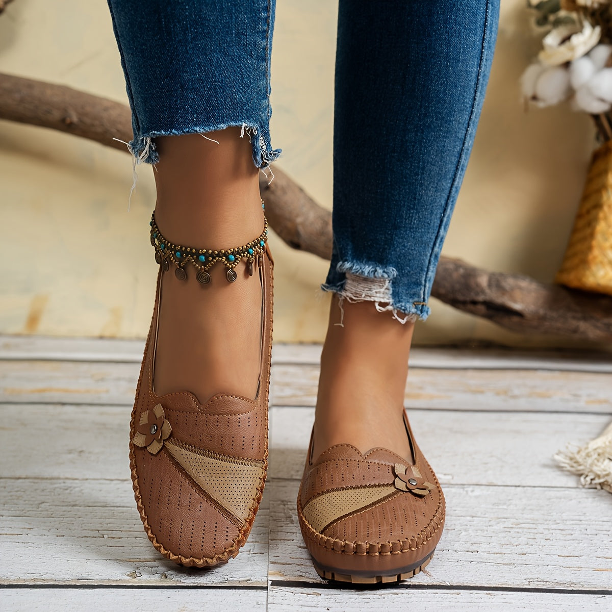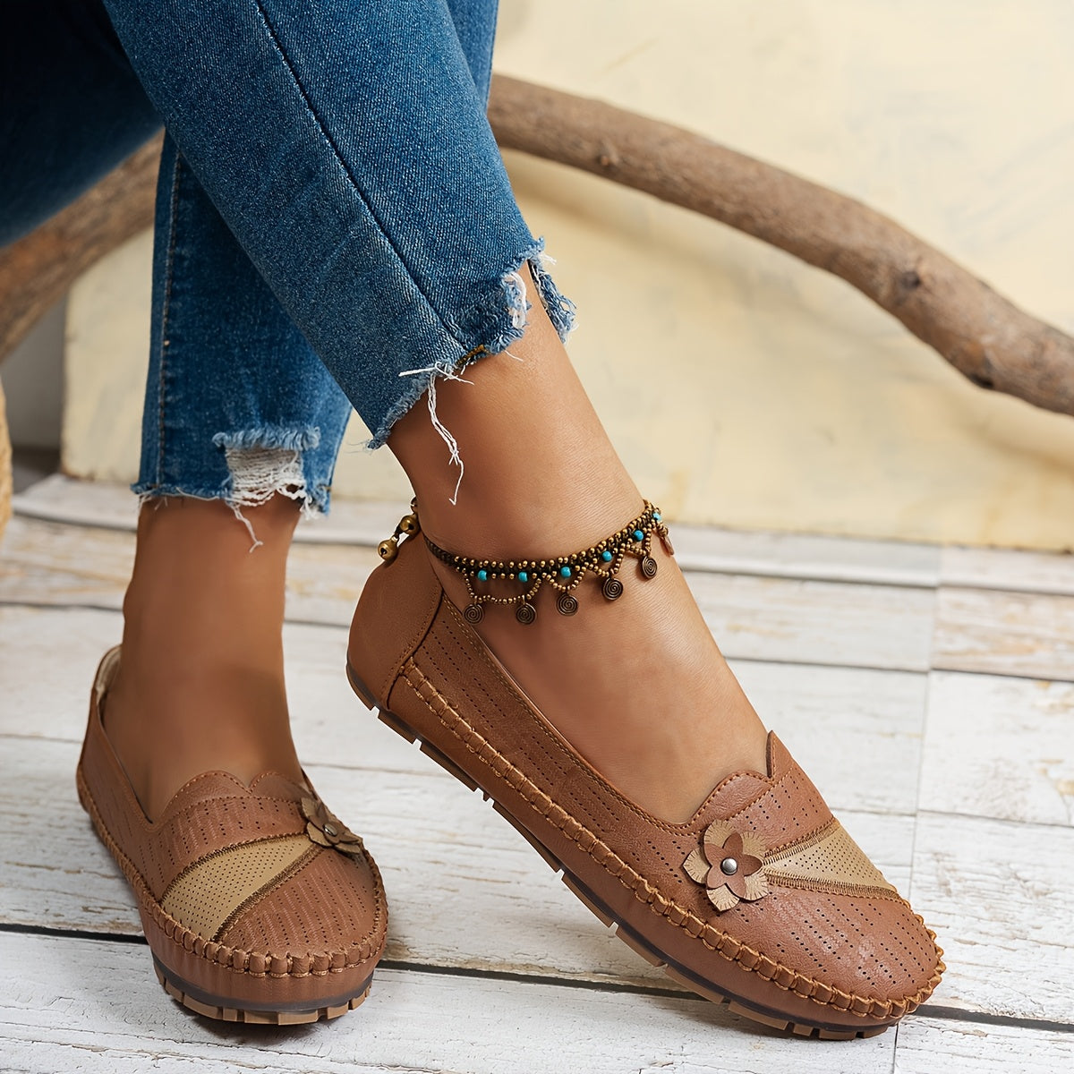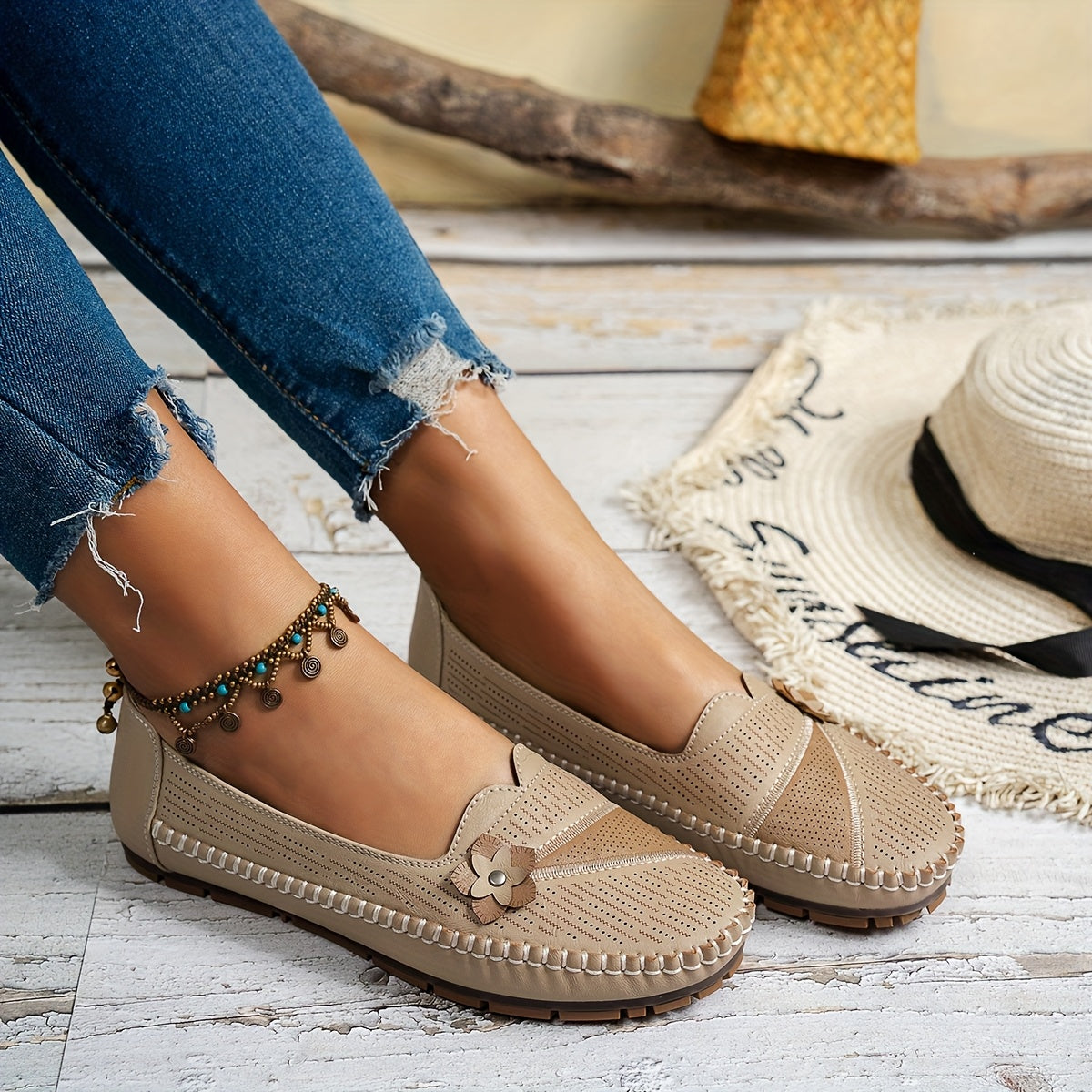 Women's Breathable Flat Shoes with Floral Embellishment and Bow in Beige