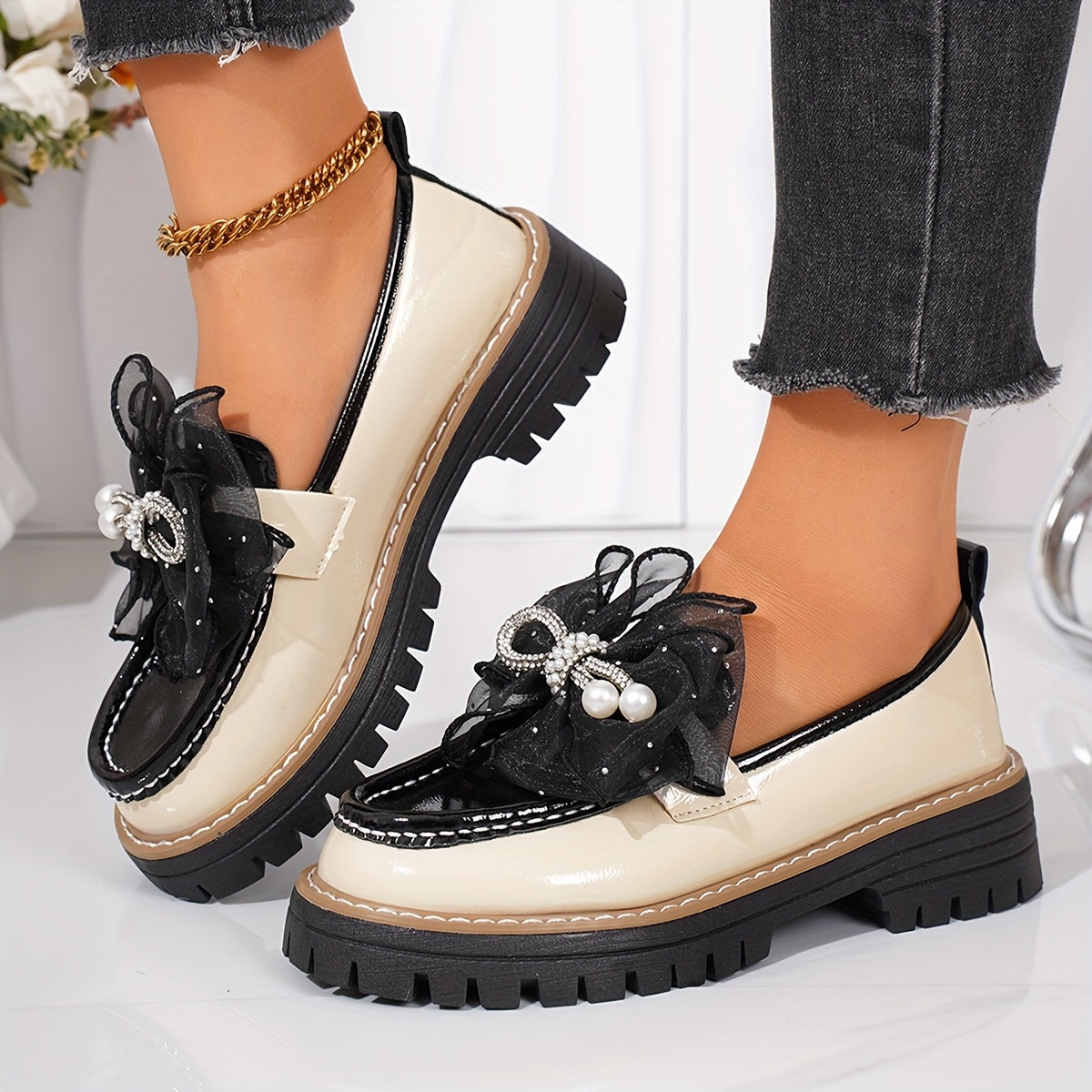 Women's Chunky Platform Loafers Slip-On Rhinestone Bow Synthetic Rubber Sole