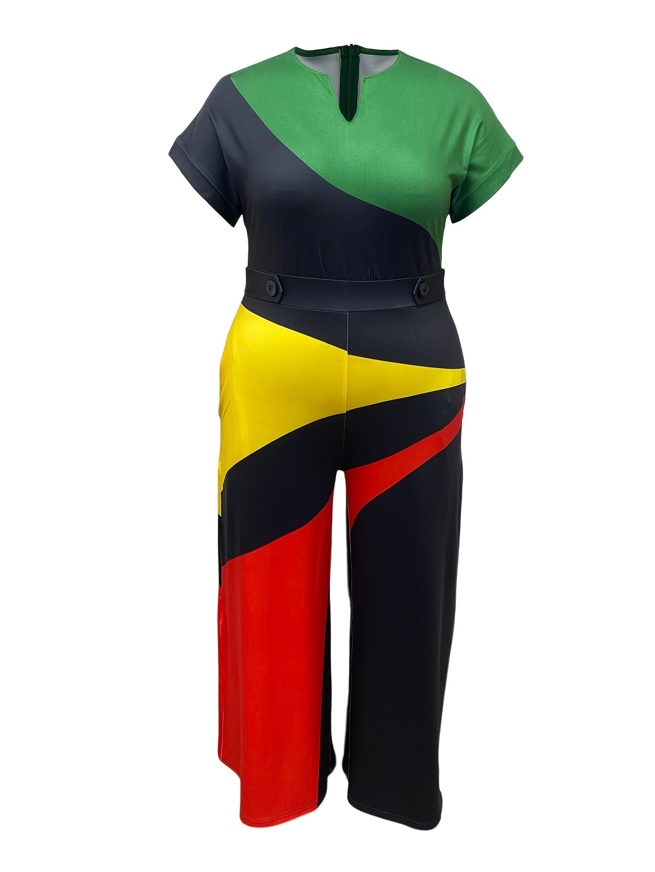 Women's Color-Block V-Neck Short Sleeve Jumpsuit Wide Leg Casual