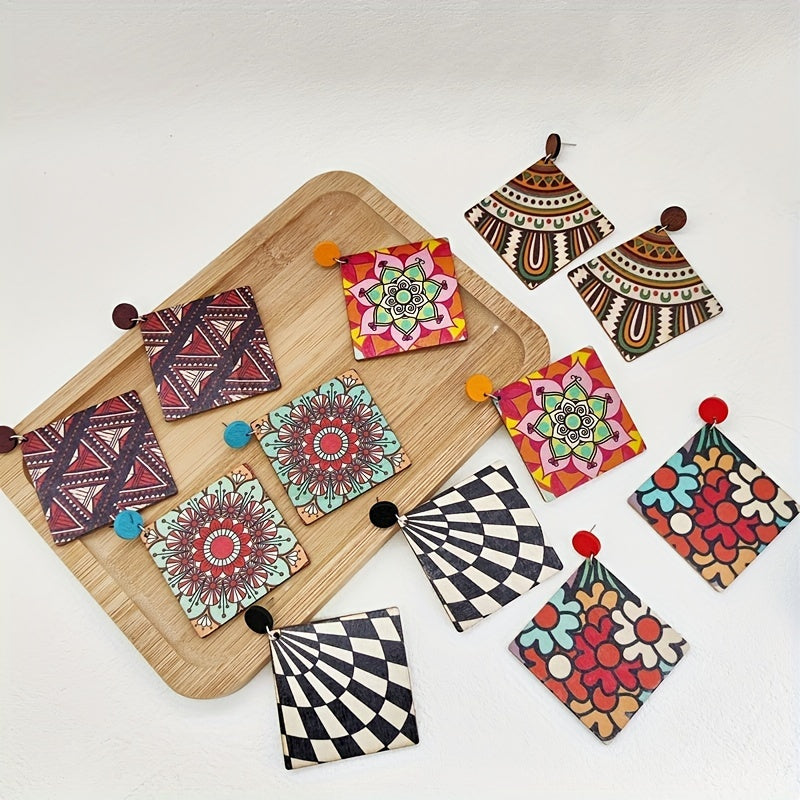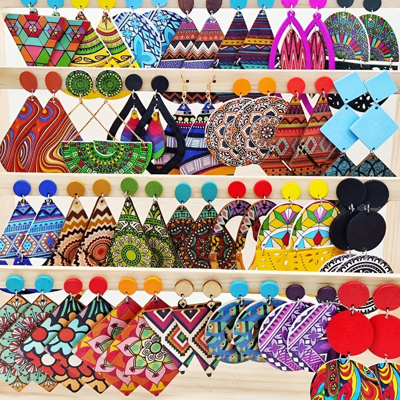 Women's Bohemian Wooden Drop and Geometric Earrings with Colorful Prints