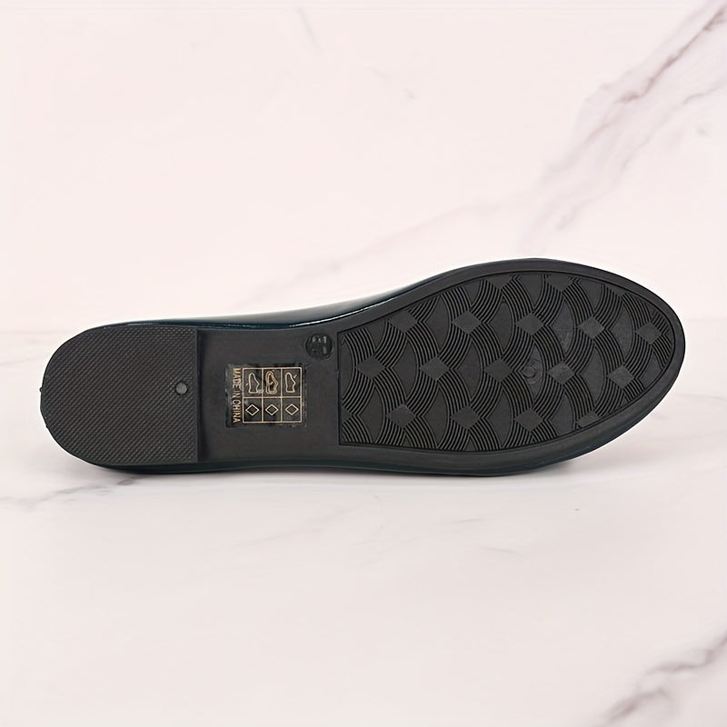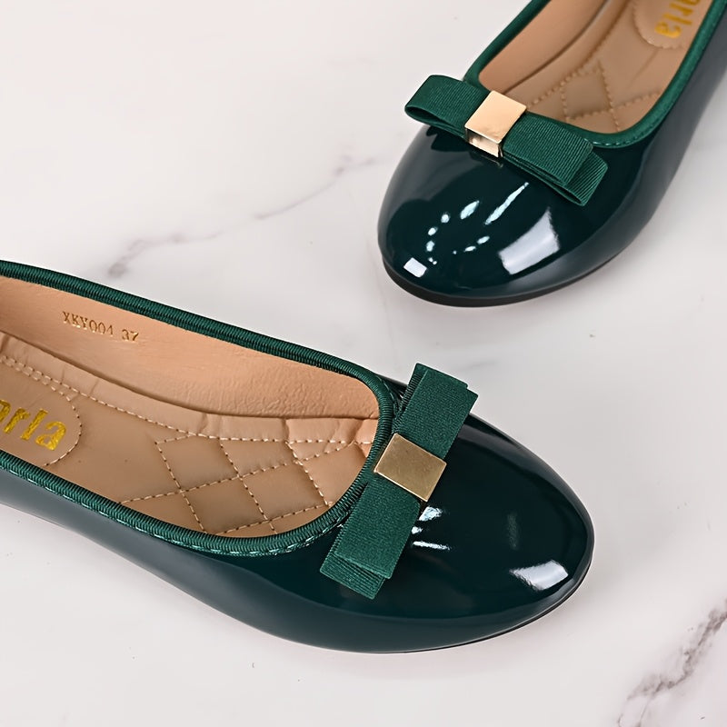 Women's Emerald Green Glossy Mary Jane Flats with Bow, Slip-On, Comfort