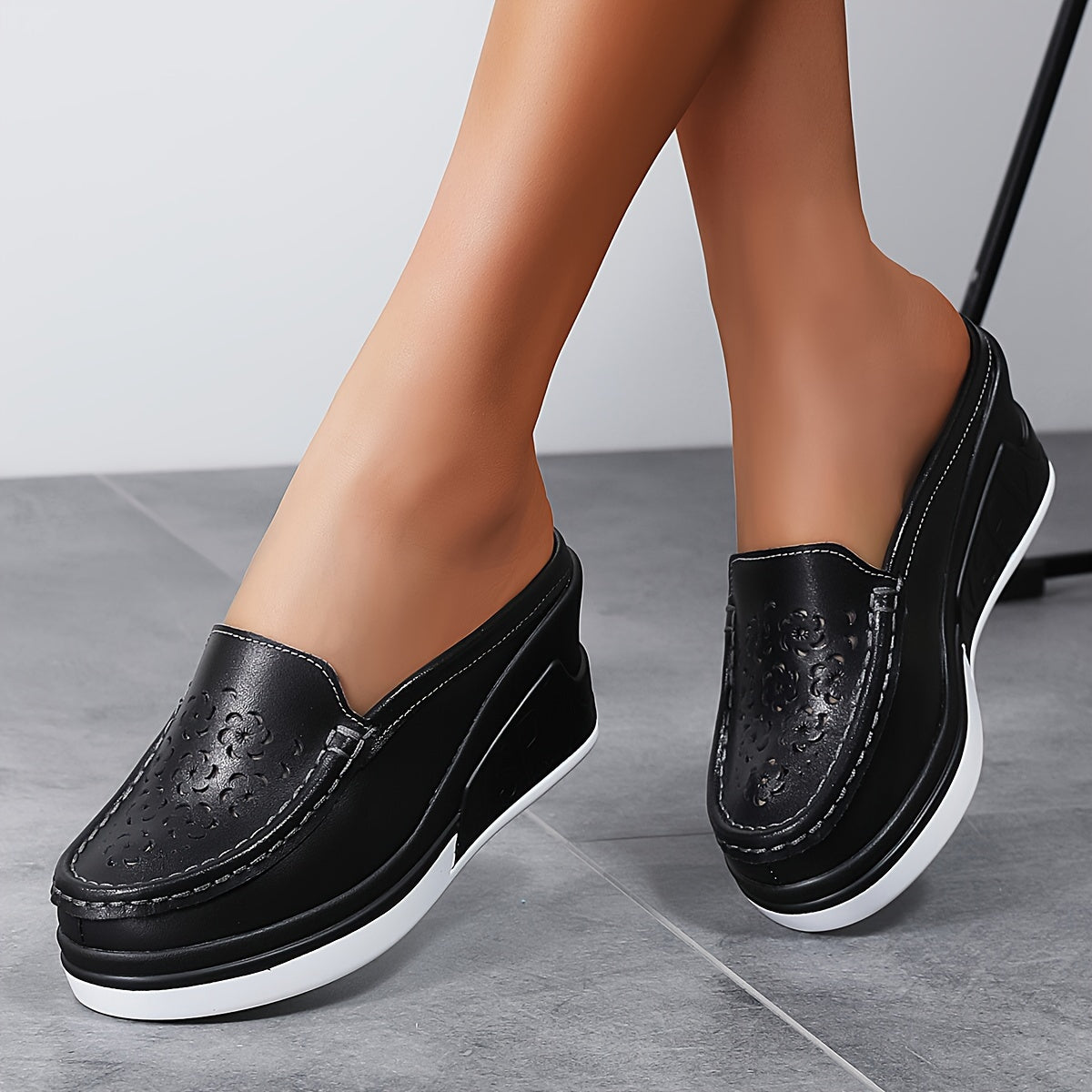 Women's Faux Leather Platform Sandals Slip-On Mules Hollow Out Casual Shoes