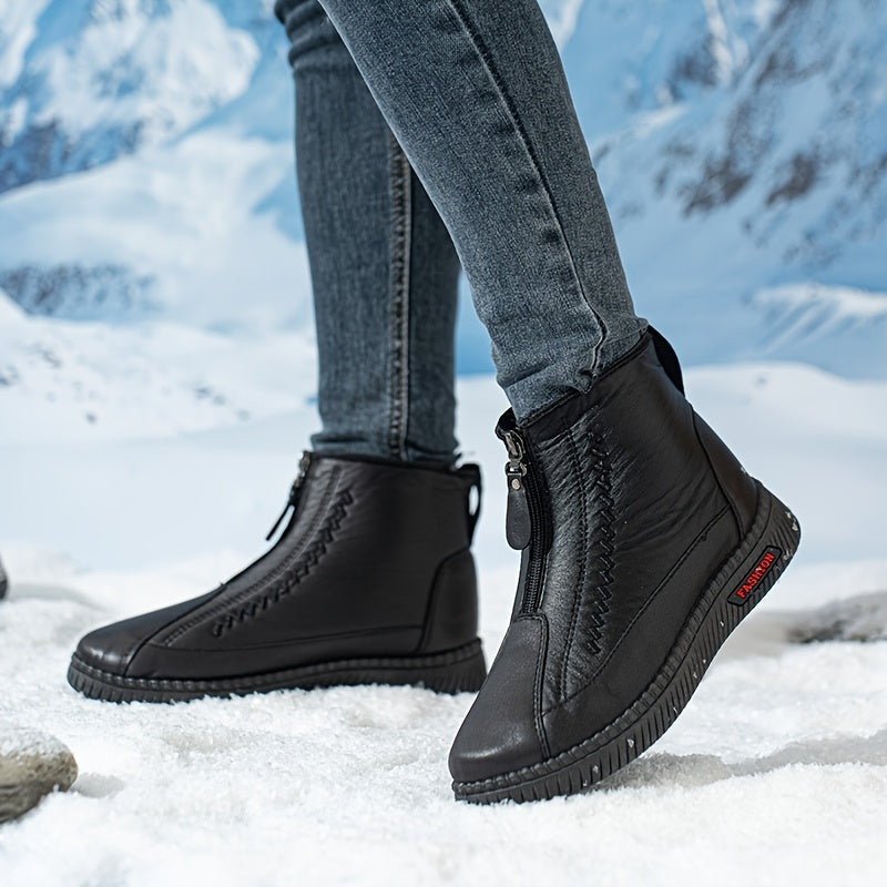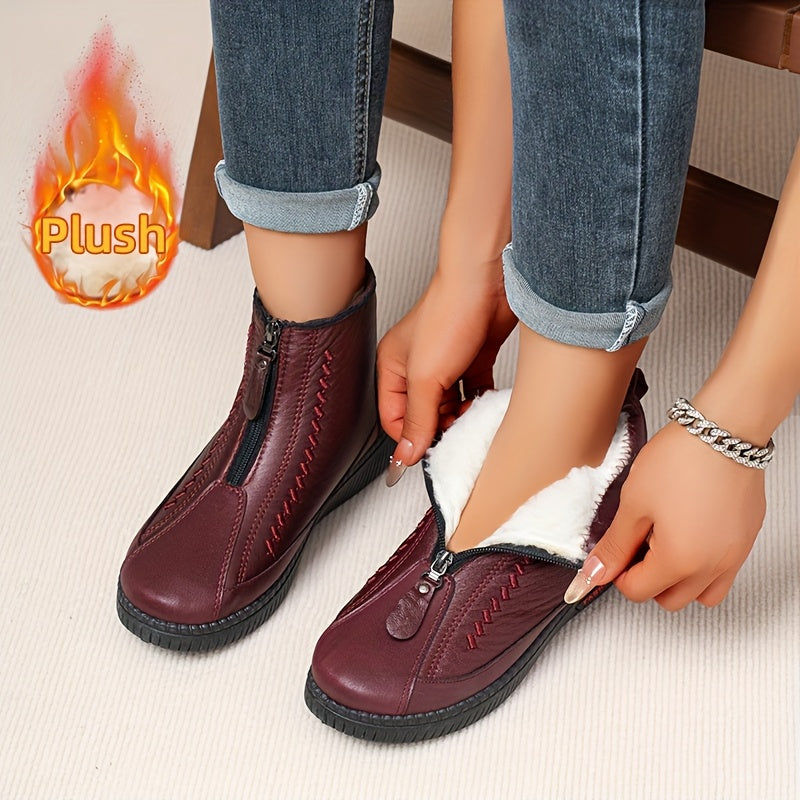 Women’s Fleece-Lined Slip-On Winter Boots with Zipper, Flat Sole in Burgundy Black White