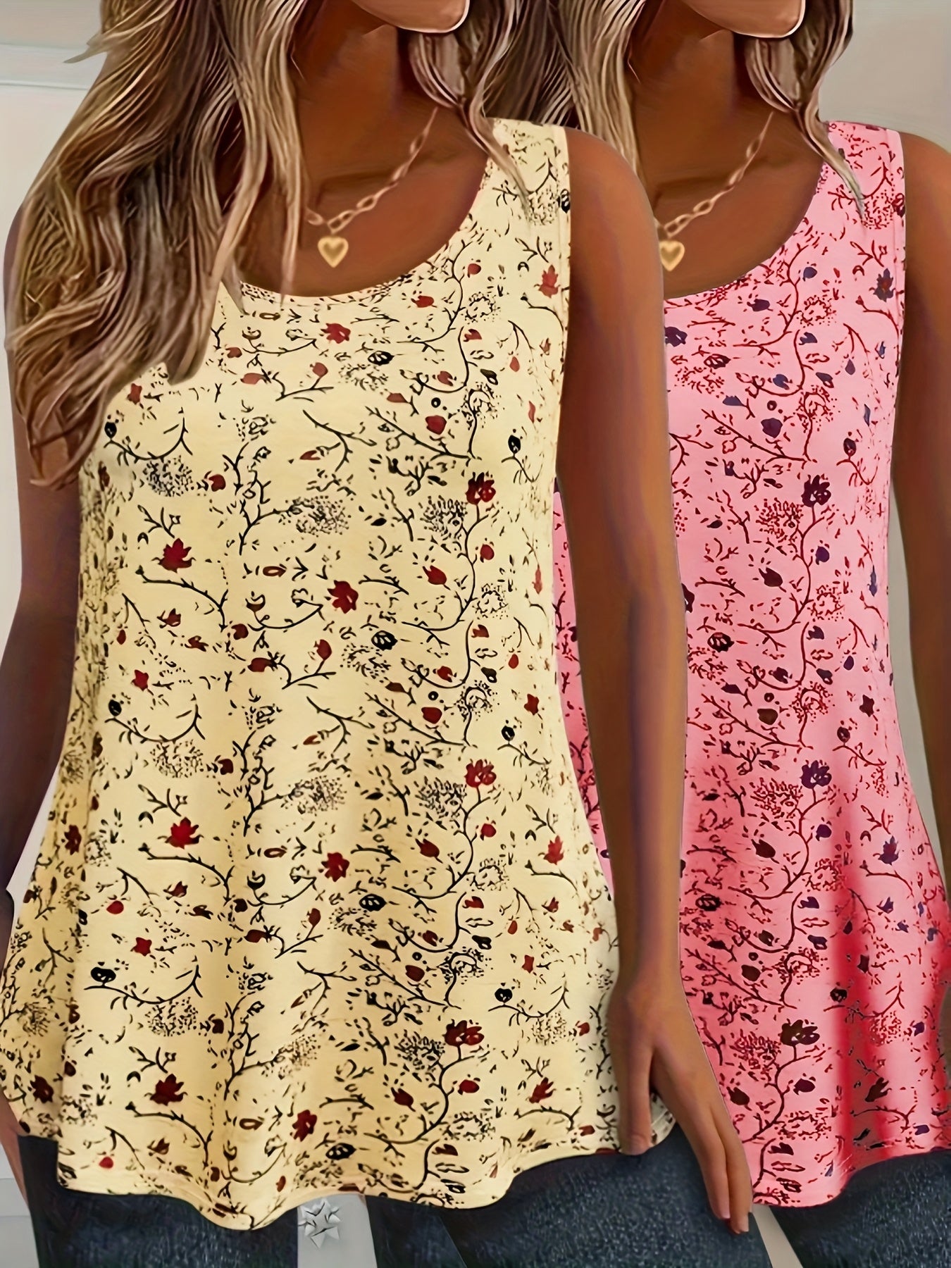 Women’s Floral Print Tank Tops 2 Pack Stretchy Polyester Summer Vests Red Blue
