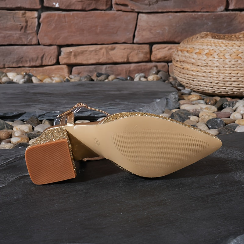 Women's Gold Sequined Pointed-Toe Pumps with Chunky Heels for Daily Wear