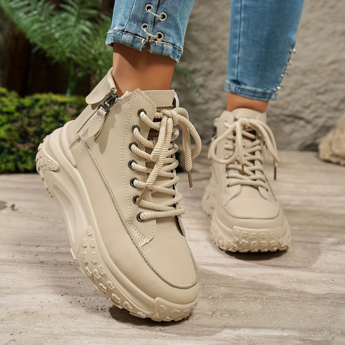 Women's High-Top Platform Sneakers with Rubber Sole Slip-Resistant Beige Black