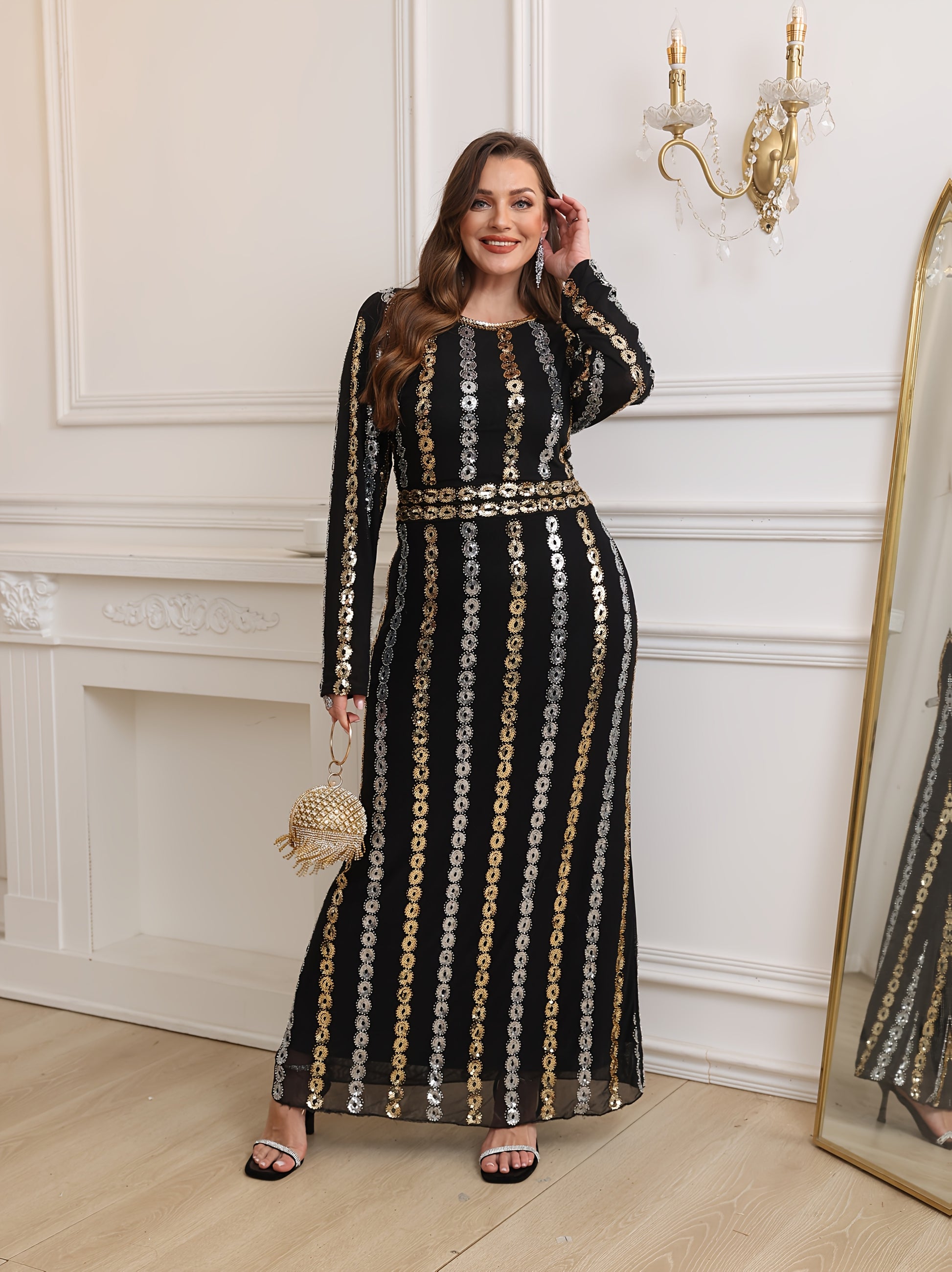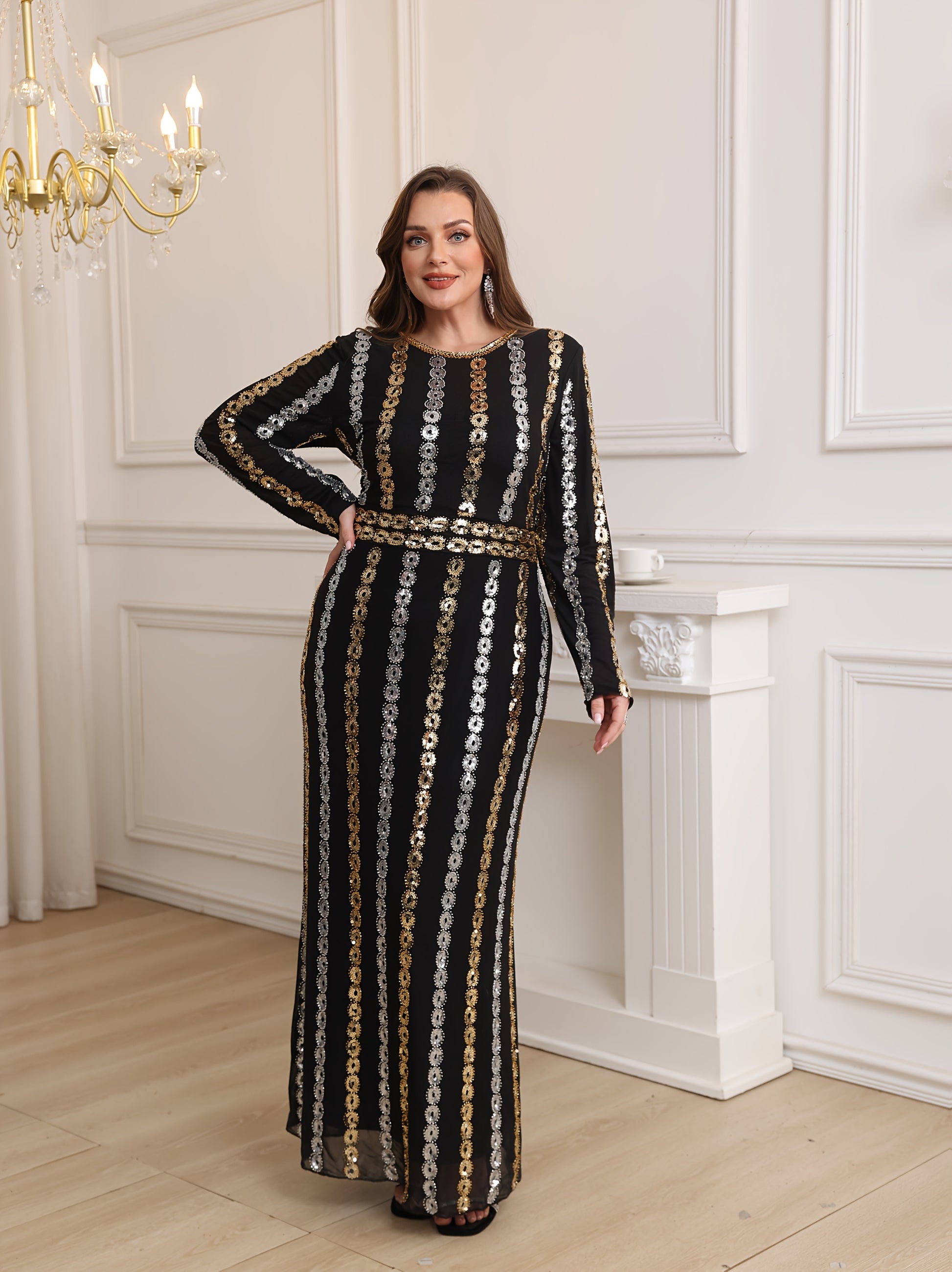 Women's Long Sleeve Sequin Evening Gown for Parties with Round Neckline