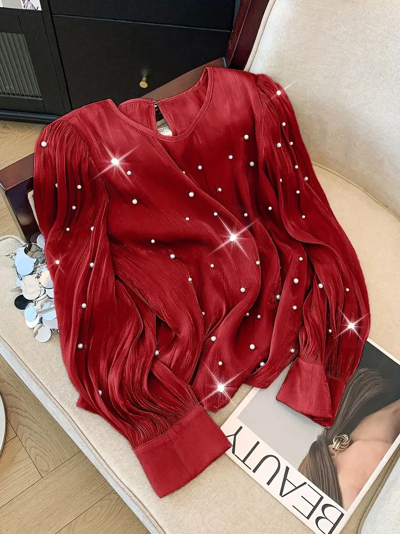 Women's Beaded V-Neck Blouse Long Sleeve Polyester Elegant French Style for Spring Fall Events