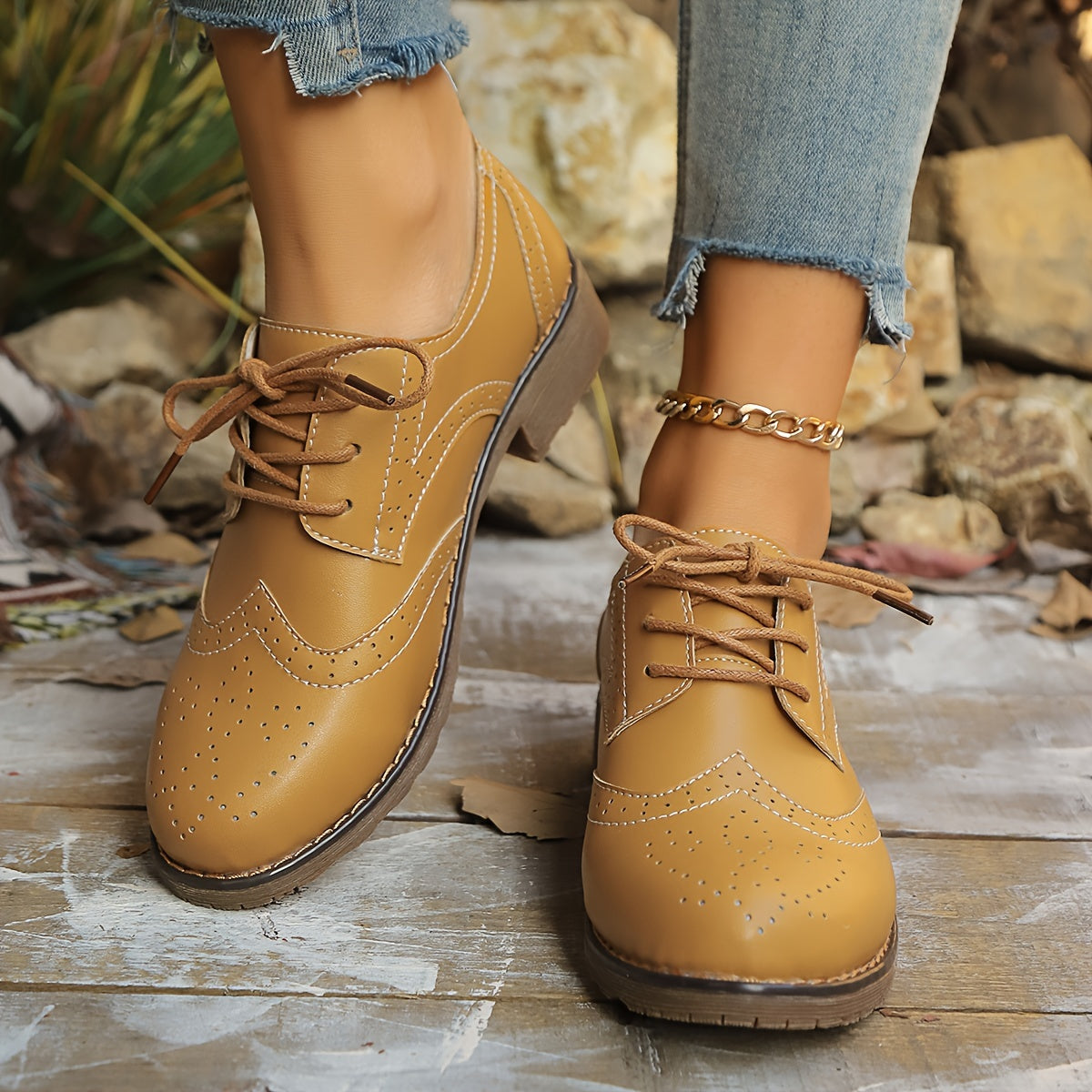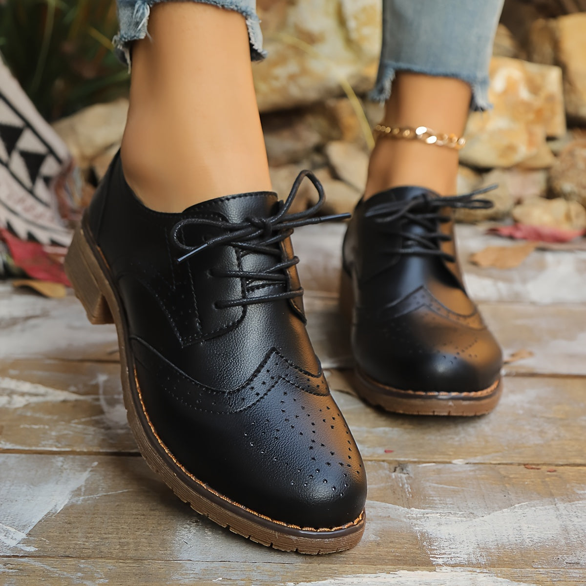 Women’s Perforated Faux Leather Brogue Shoes - Chunky Heel, Classic Lace-Up