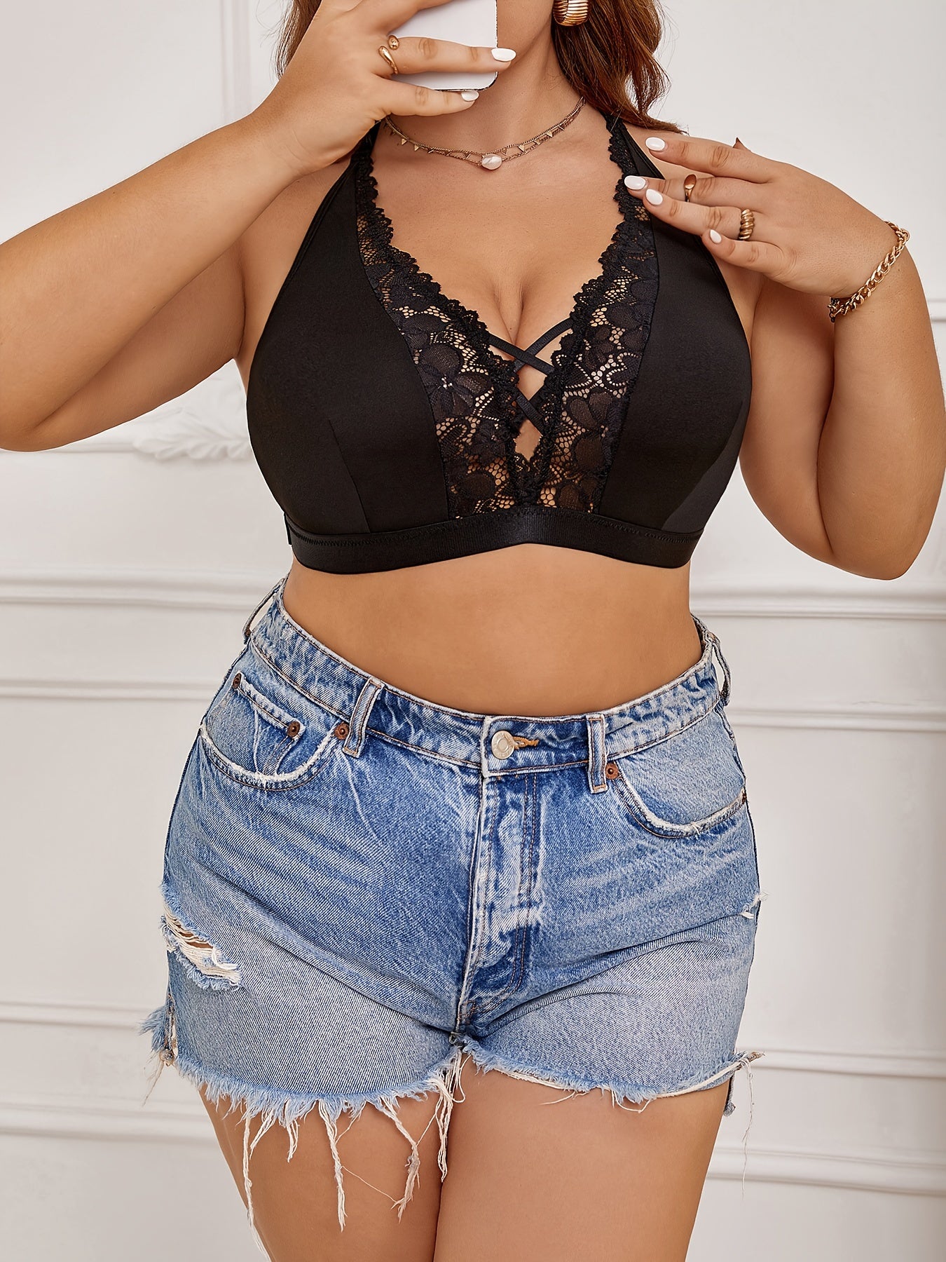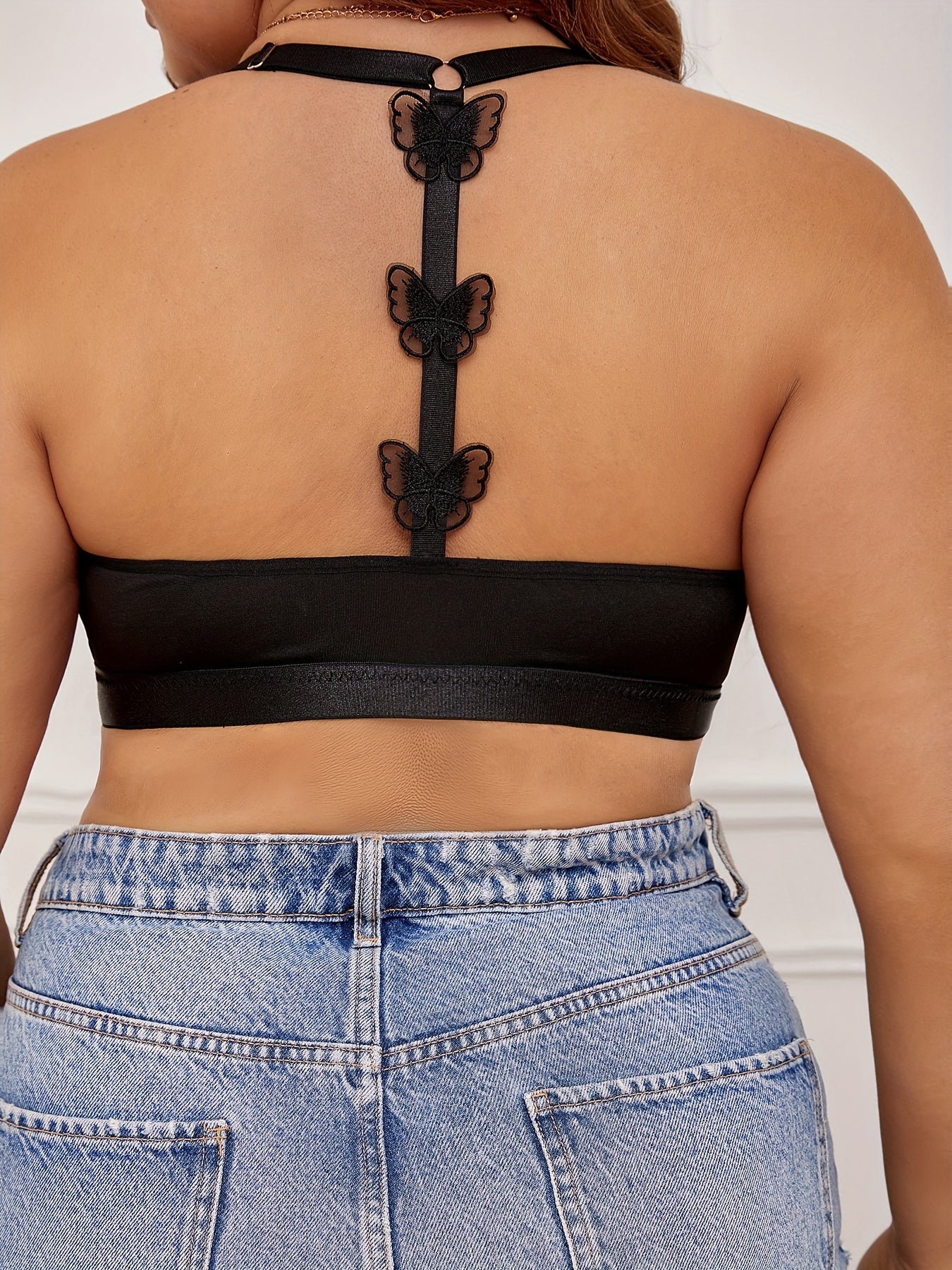 Women's Plus Size Erotic Lace Cross Strap Halter Bra with Butterfly Appliques
