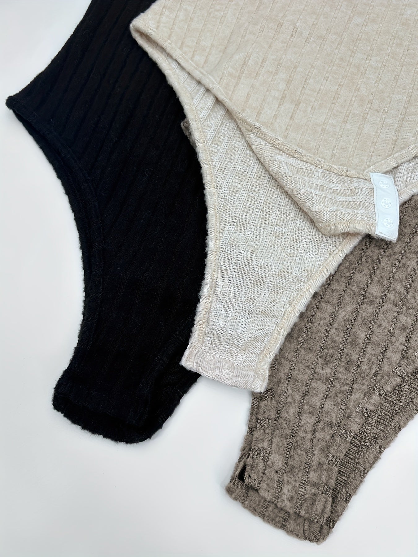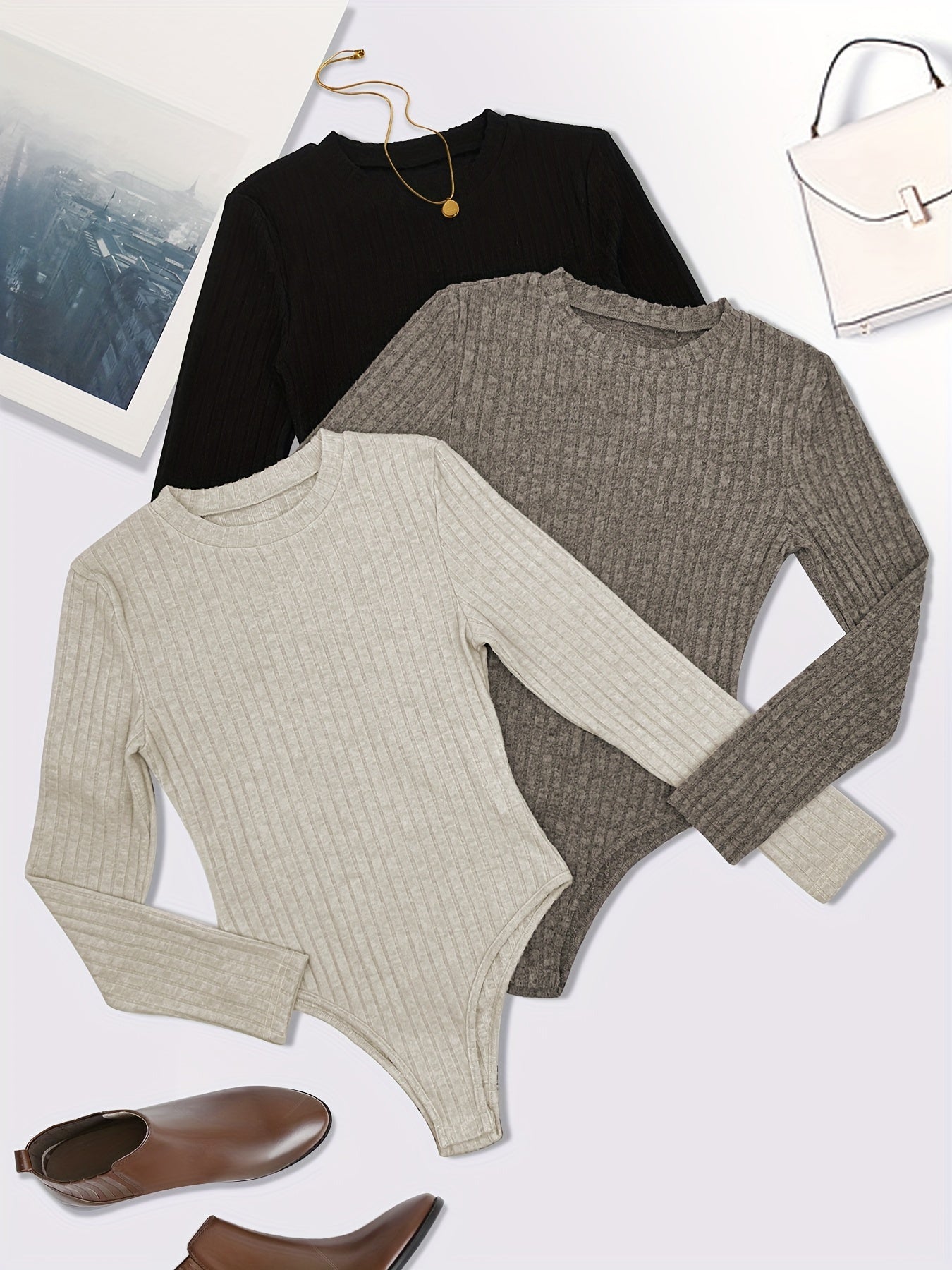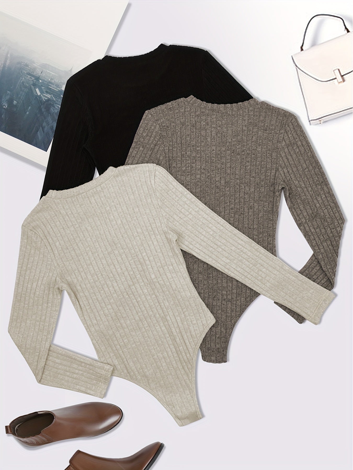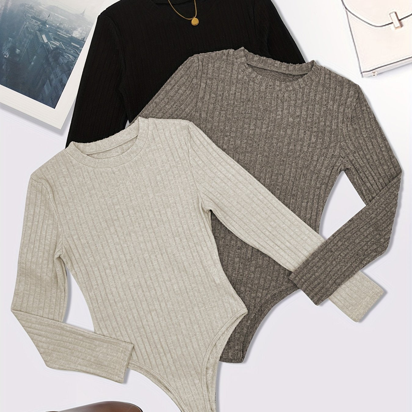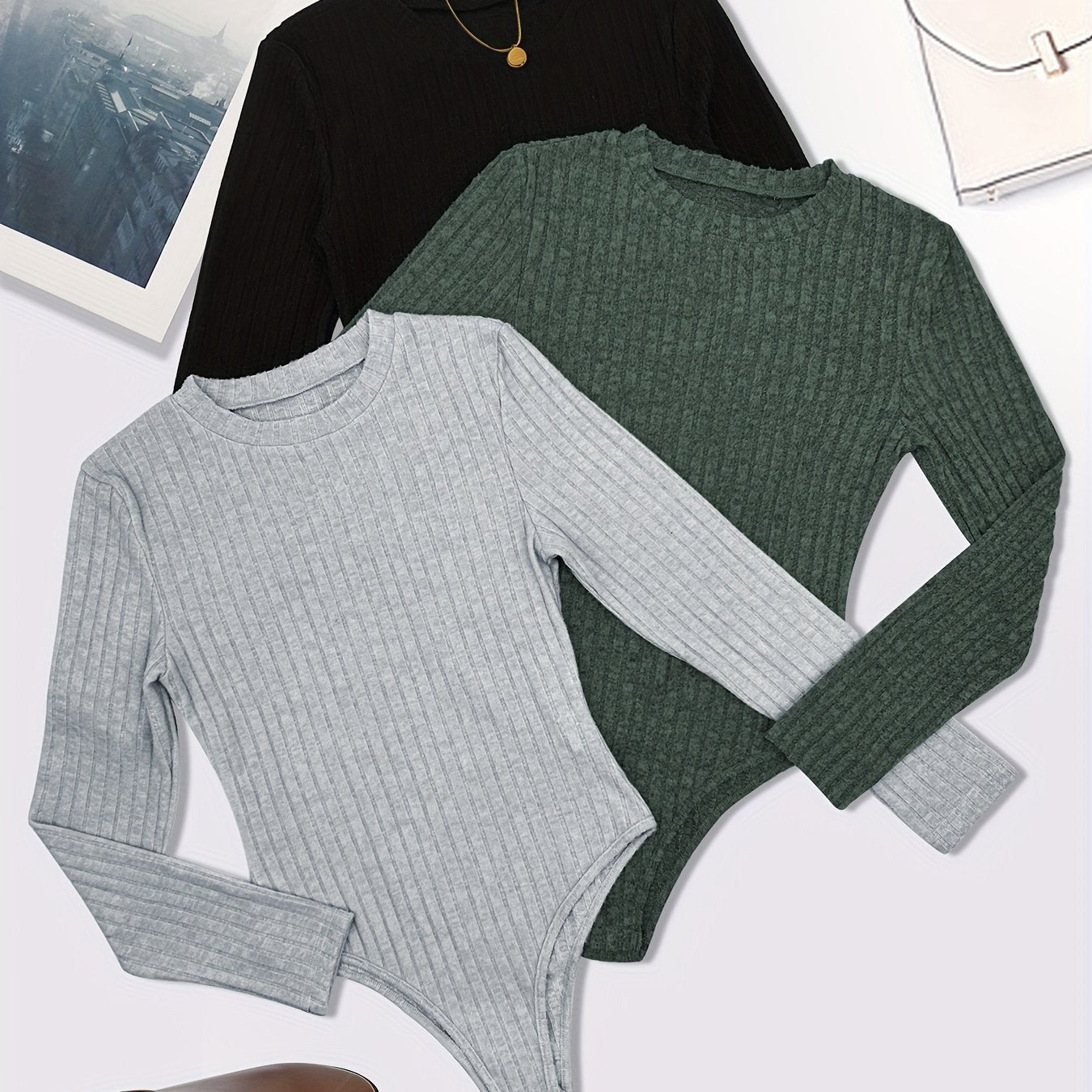 Women's Plus Size Ribbed Long Sleeve Bodysuit 3 Pack Solid Black White Navy