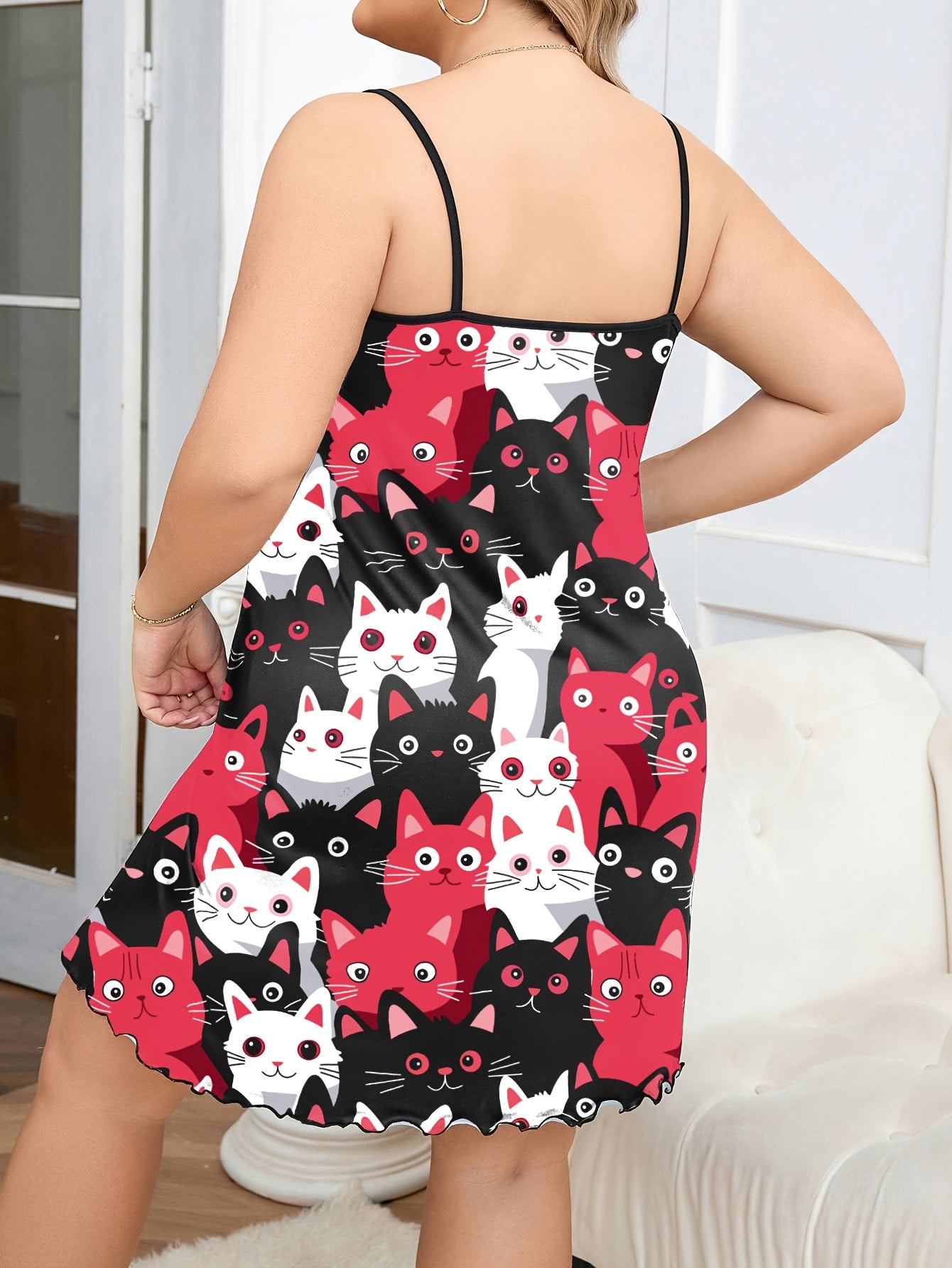 Women's Sleeveless Nightgown Casual Dress Red Black Cartoon Cat Print