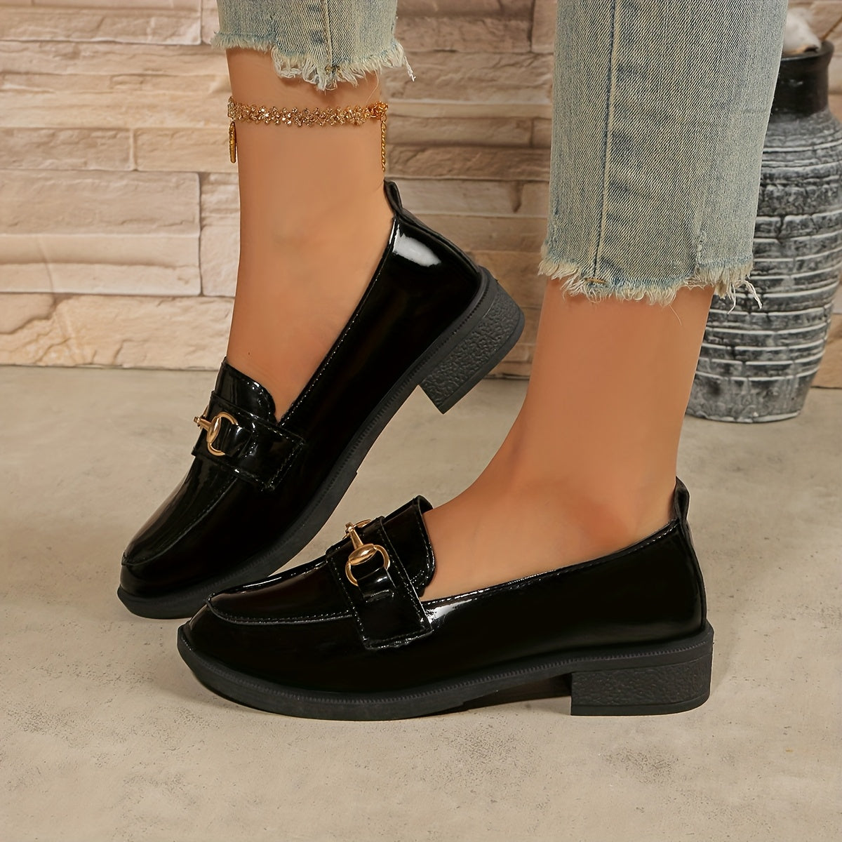 Women’s Slip-On Loafers Black PU Metallic Buckle Casual Office Shoes