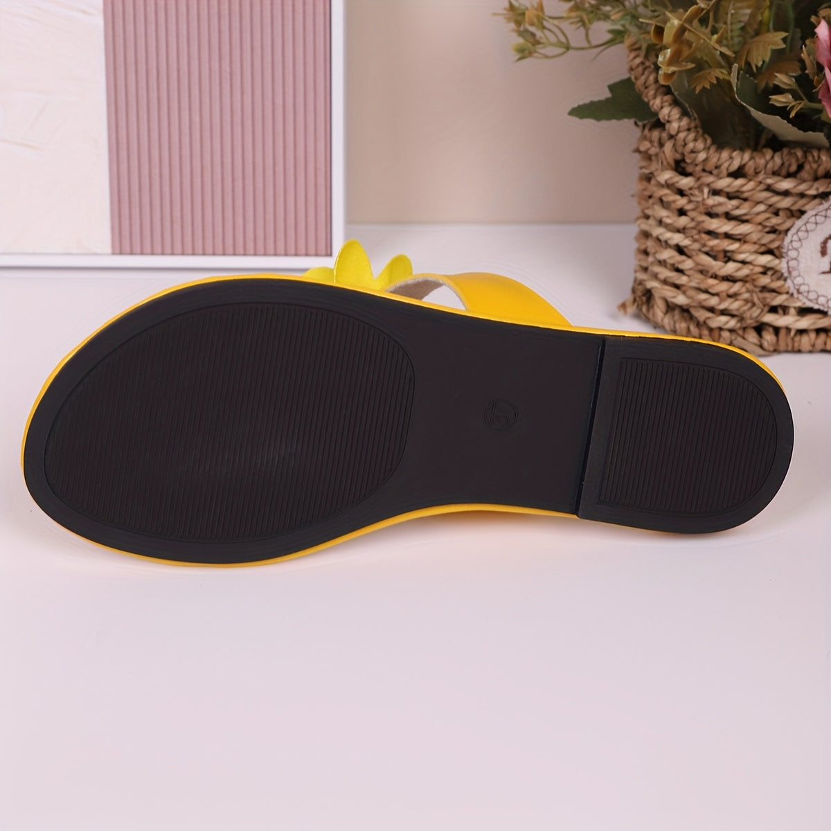 Women's Slip-On Open-Toe Flat Sandals with Floral Embellishments in Yellow