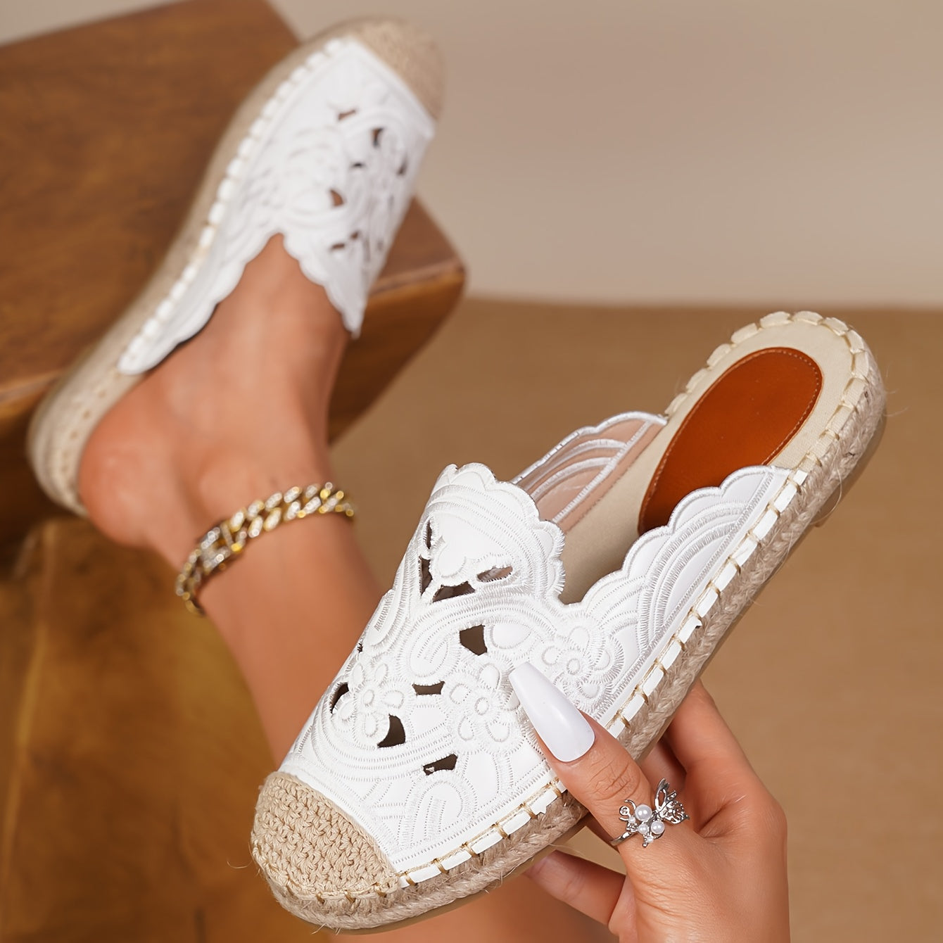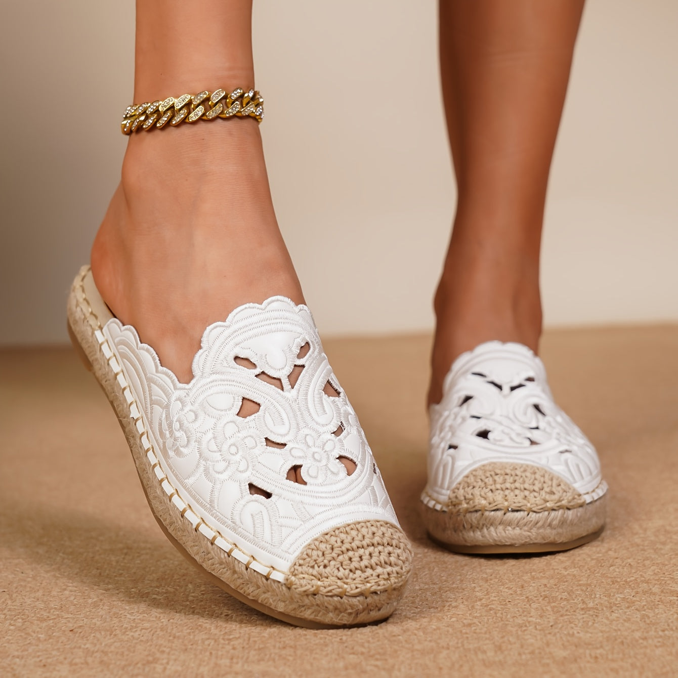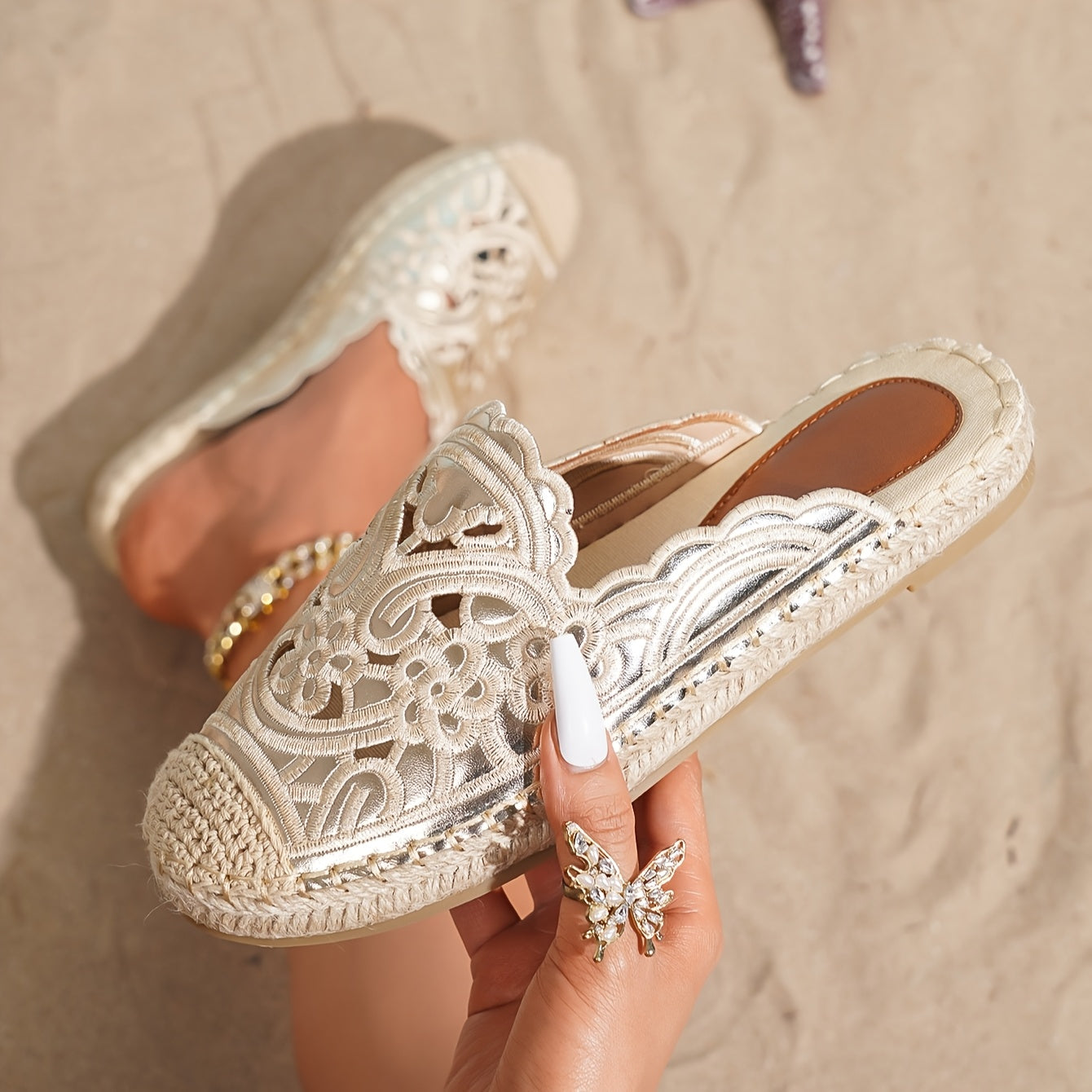 Women's Vintage Embroidered Mask Flat Shoes Slip-On Round Toe PU Beach Shoes