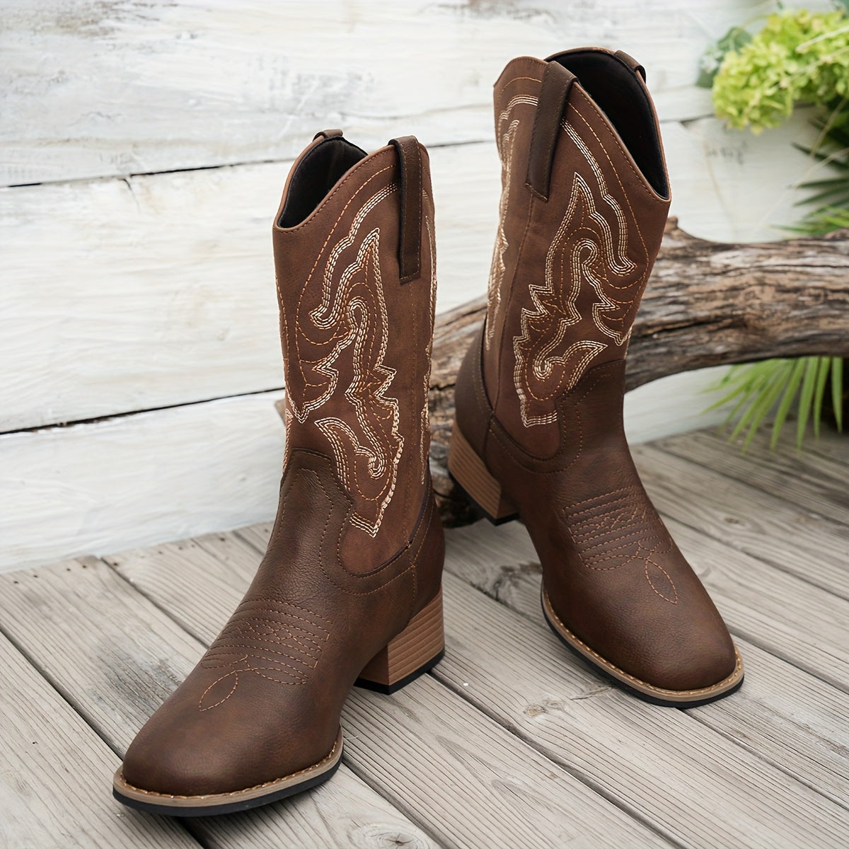 Women's Western Cowboy Boots Faux Leather Floral Embroidery Square Toe Mid-Calf