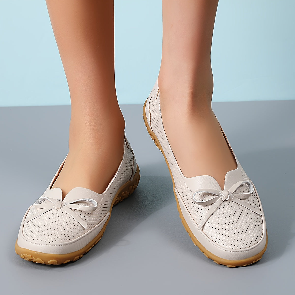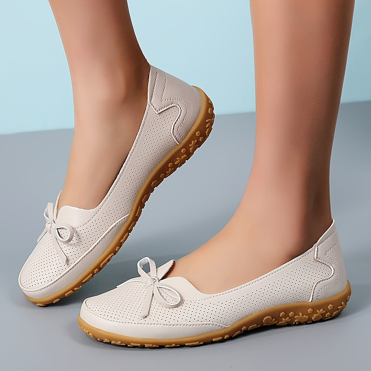 Women's White Slip-On Flats with Bow, Ventilation Holes, Comfortable Sole