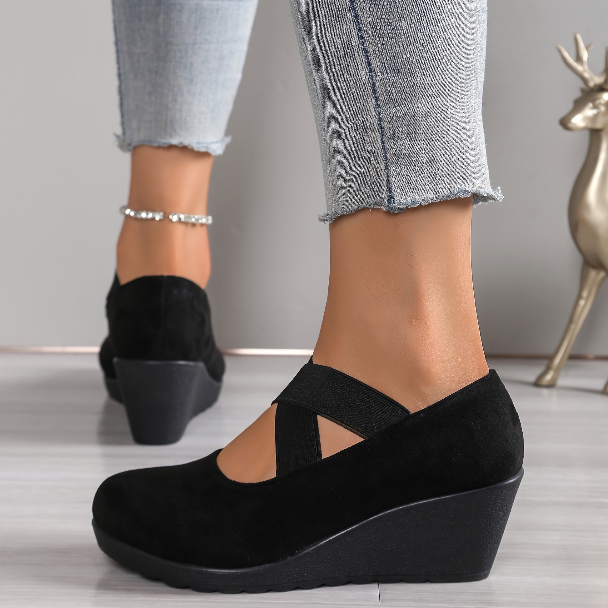 Women Slip-On Wedge Shoes Black Breathable Fabric All-Season Comfort