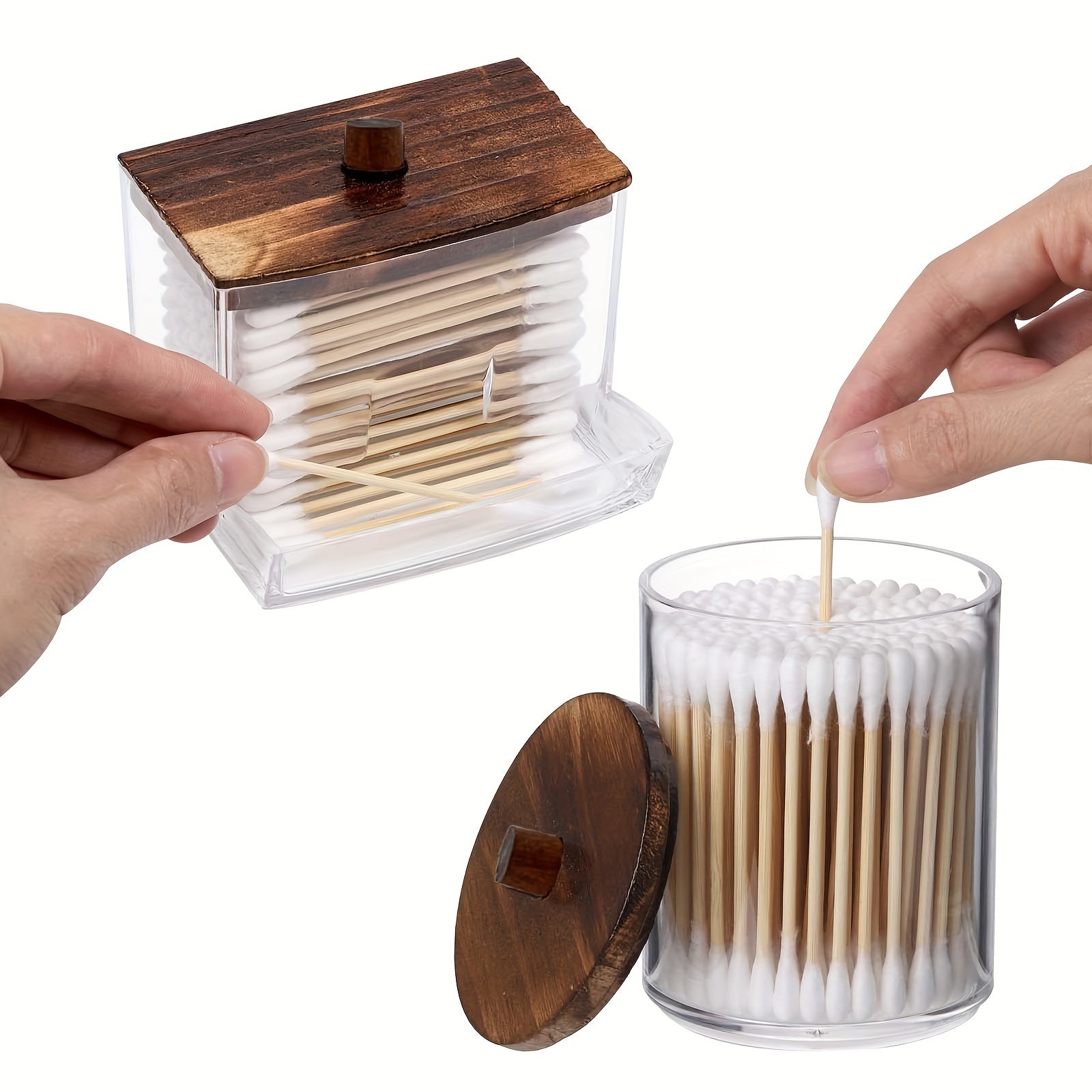 Bathroom Storage Container Set with Brown Wood Lids for 7oz or 10oz Swabs and Cotton Balls