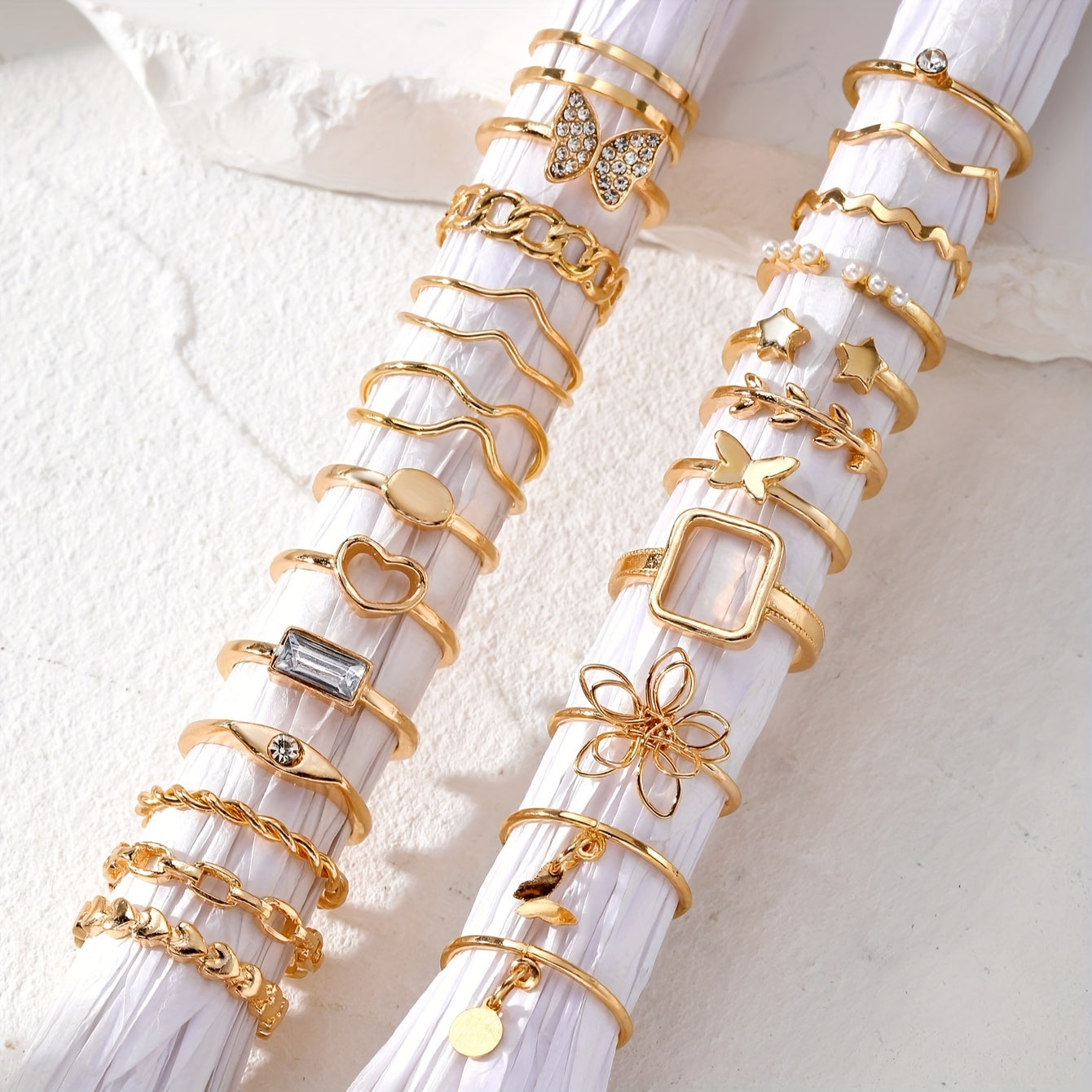 23-Piece Alloy Ring Set with Hollow Flowers and Butterflies Rhinestones for Casual Wear or Gift
