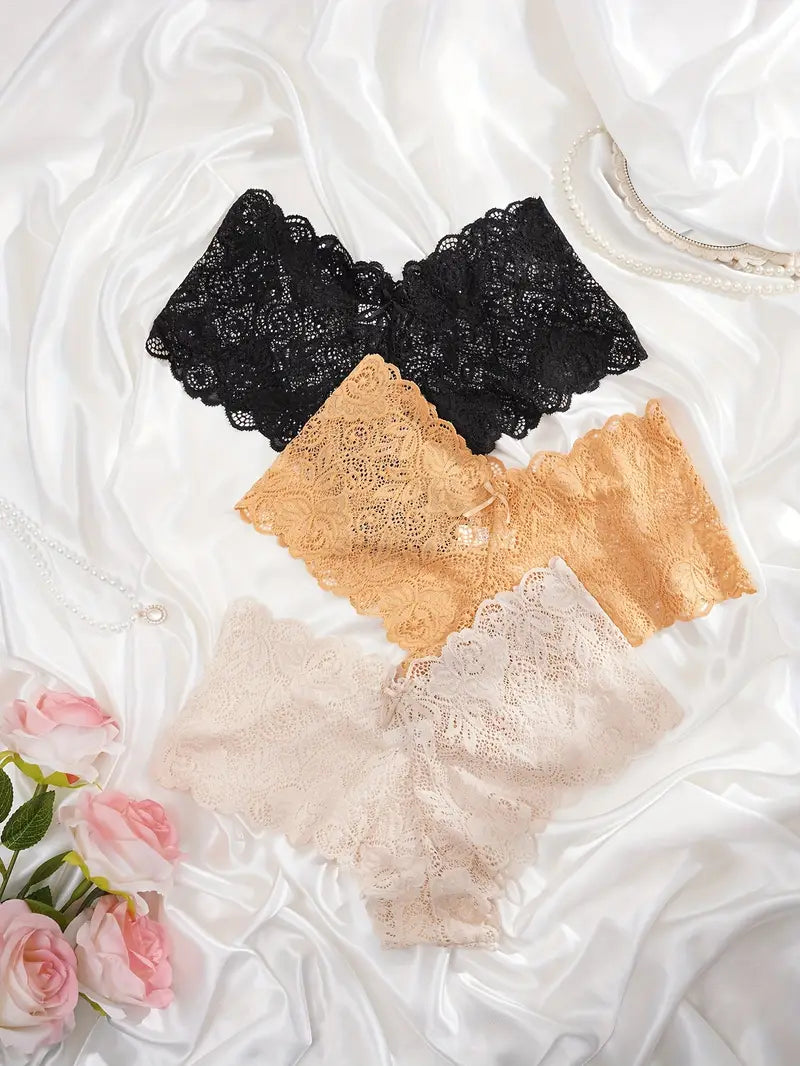 Women's Floral Lace Panties Set 3 Pack Breathable Scallop Trim Jacquard Sheer Shorts