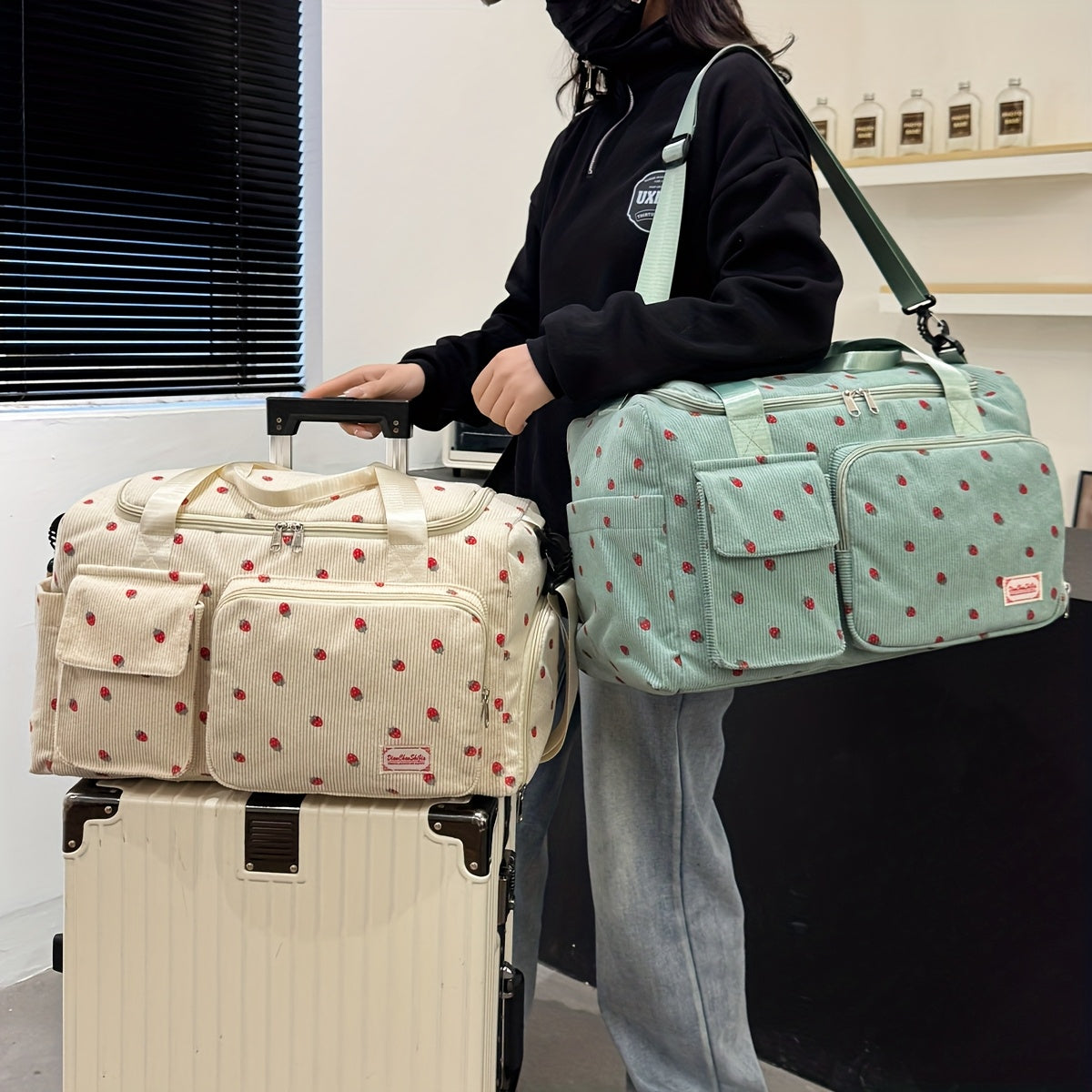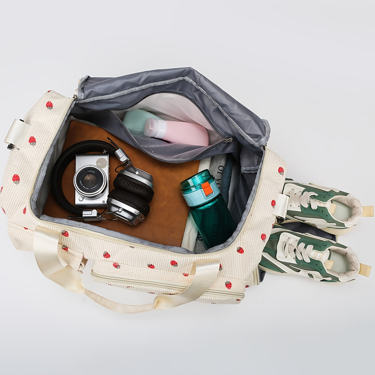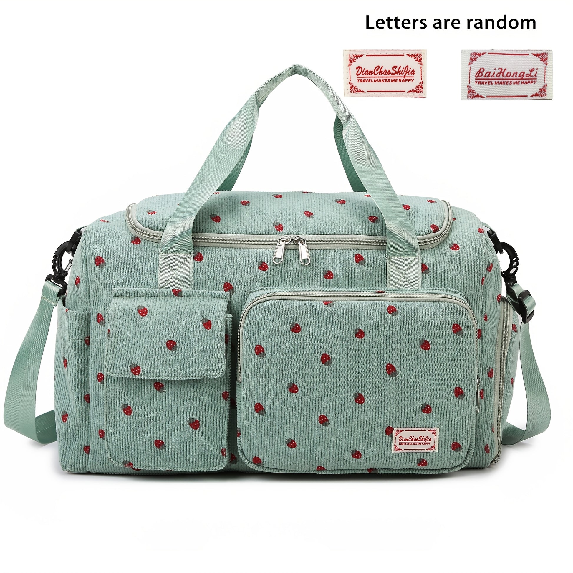 Corduroy Travel Bag with Strawberry Print Wet and Dry Separation Shoe Compartment for Vacation Gym and School