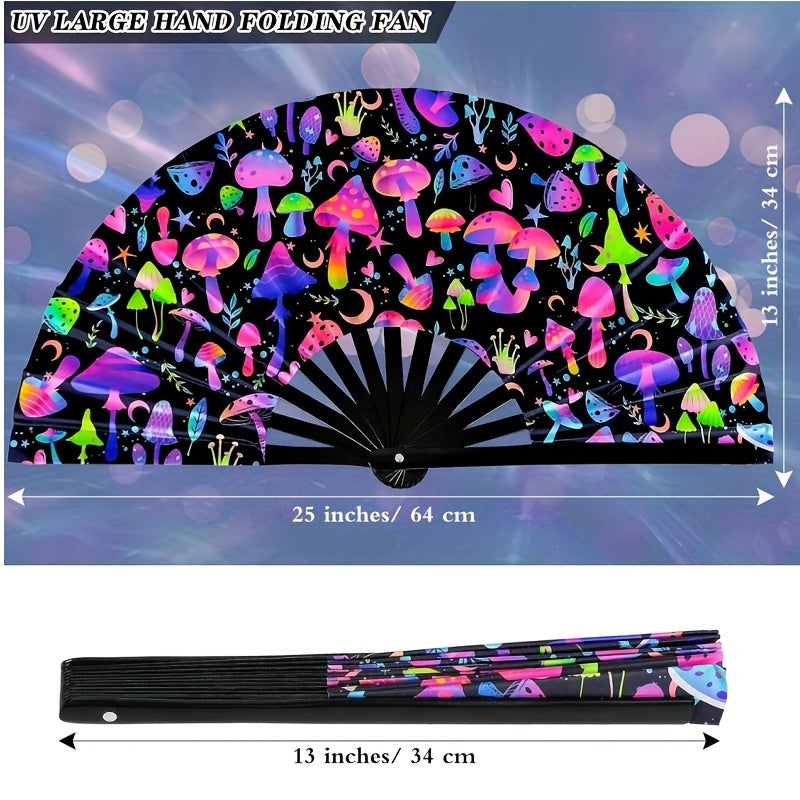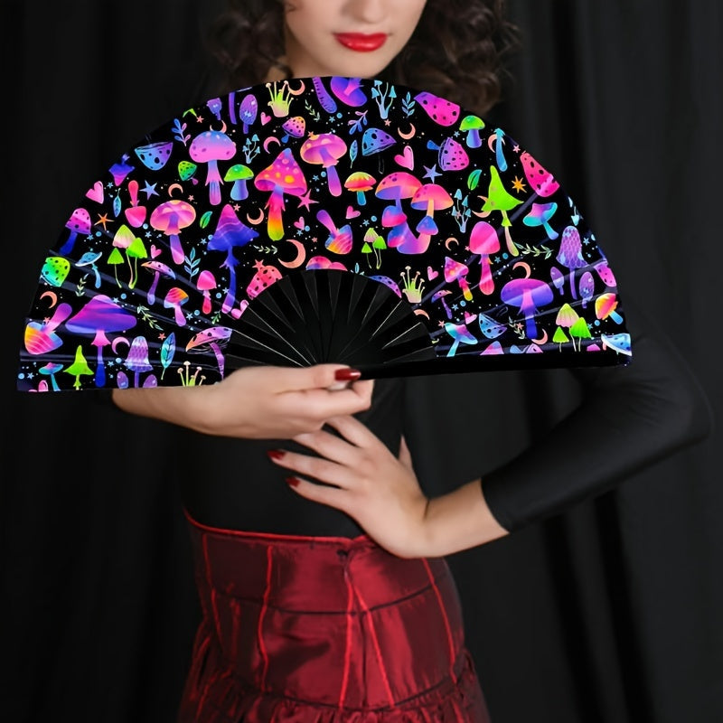 Bamboo Hand Fan with UV Glow Mushroom Design for Festivals and Raves