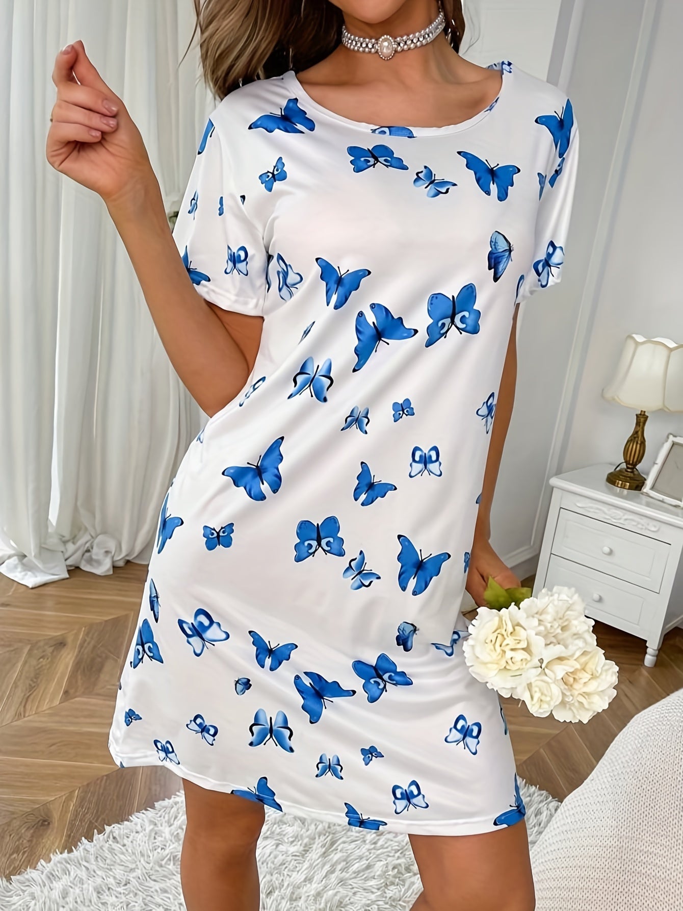 Women's Butterfly Print Pajama Dress Short Sleeve Nightwear Lounge Sleepwear