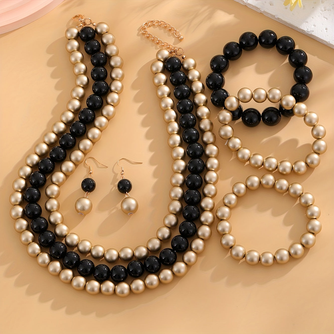 Matte Gold and Black Bead Jewelry Set for Women Necklace Bracelet Earrings Wedding Accessories