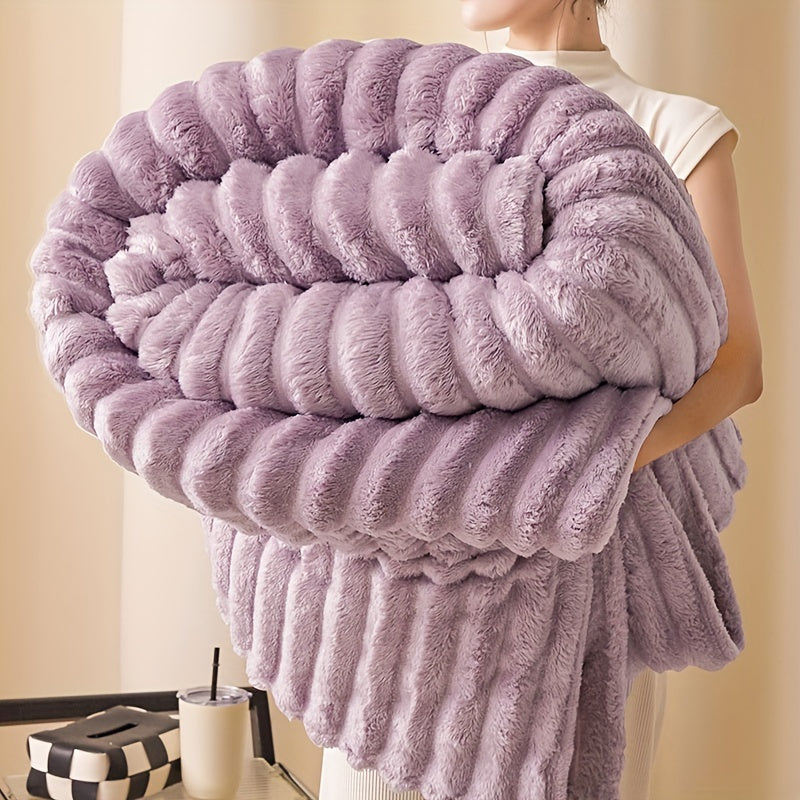 Striped Faux Fur Throw Blanket Cozy Knitted Polyester Bedspread for Sofa and Travel