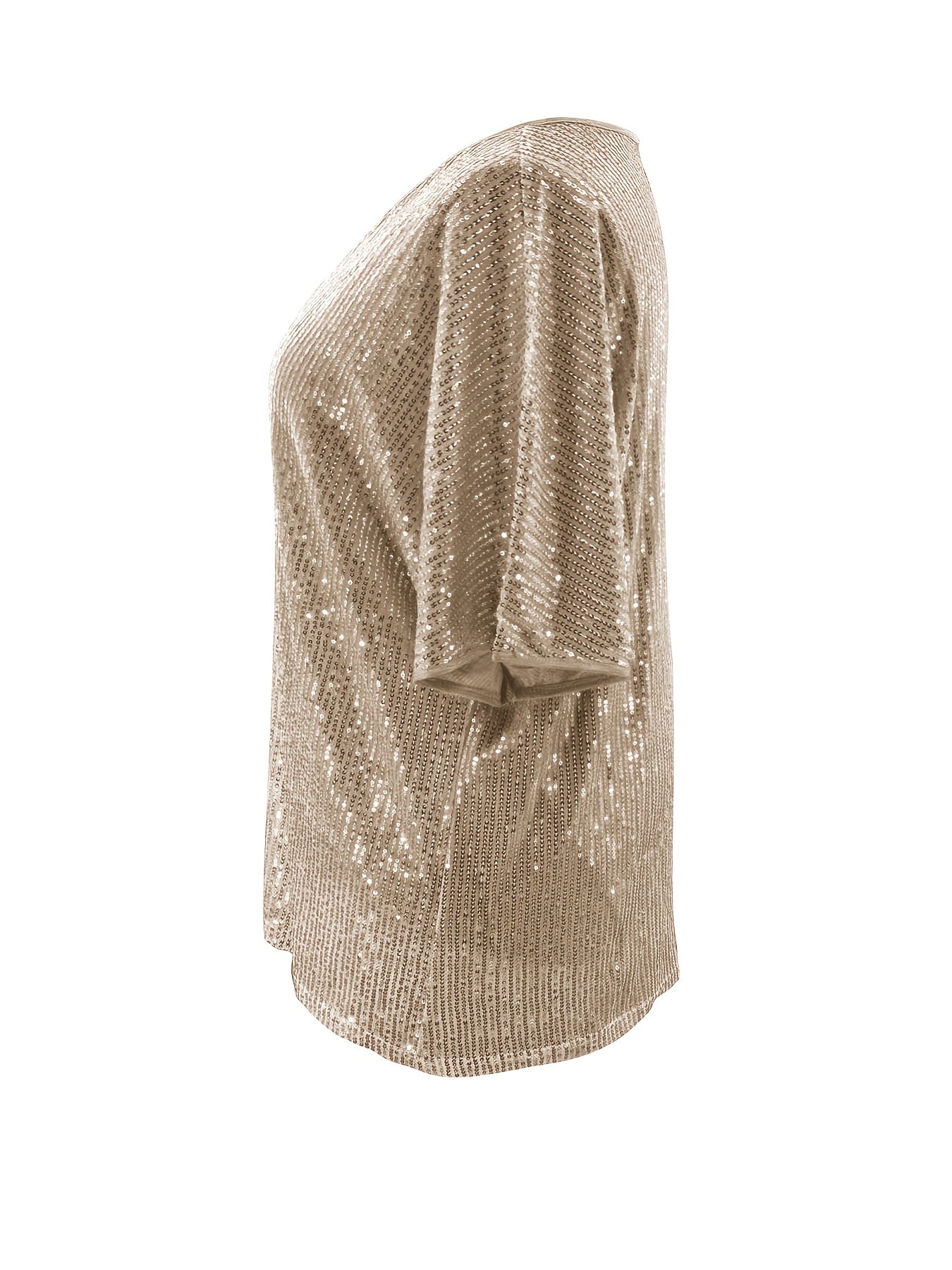 Women's Sequin V-Neck Top with Short Sleeves and Solid Color