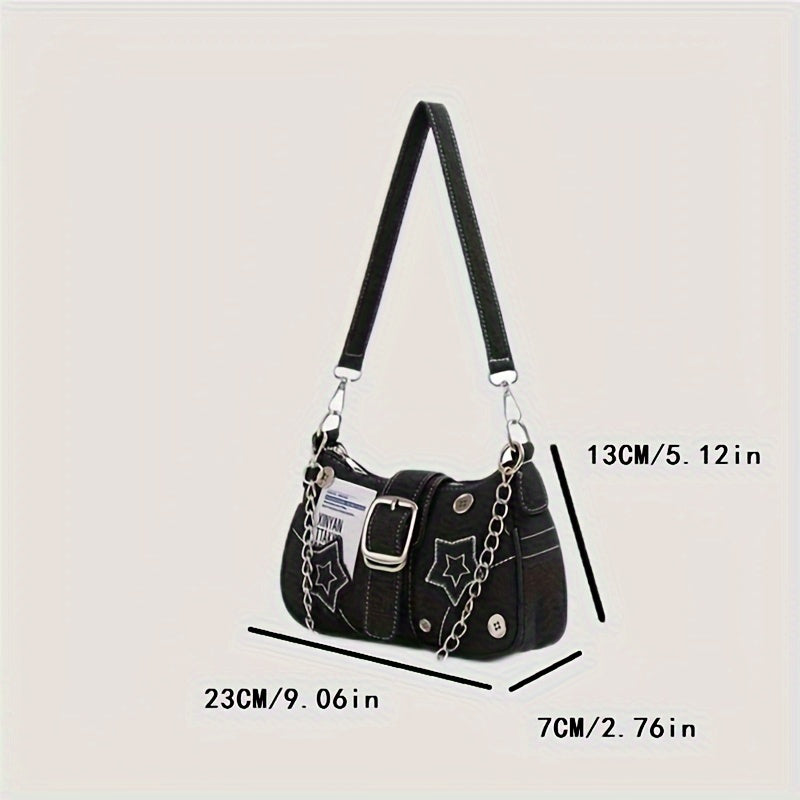 Denim Shoulder Bag with Star Pattern Moon Shape Chain Strap Zipper Closure