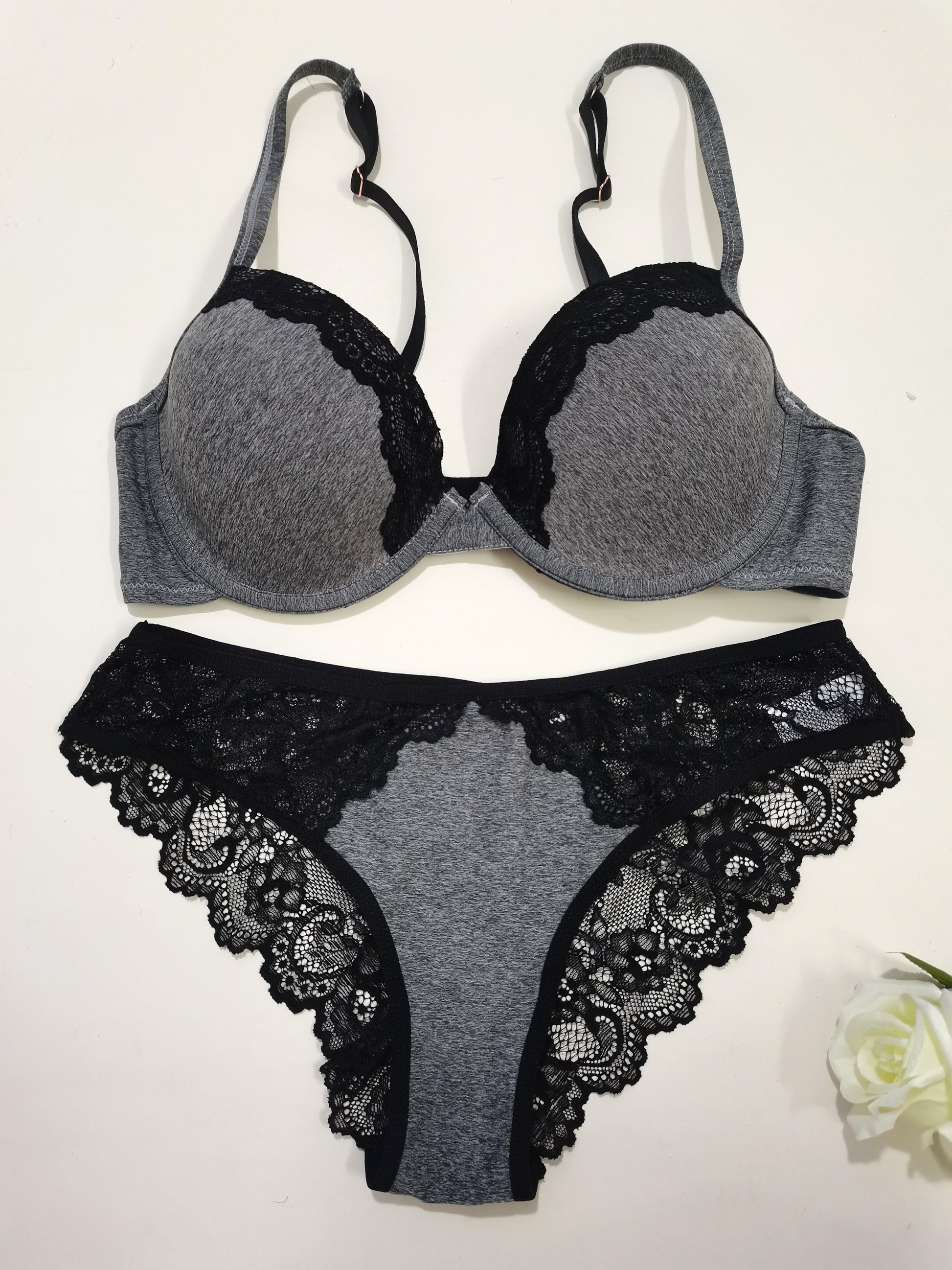 Women's Floral Lace Lingerie Set with Plunge Bra and Sheer Briefs